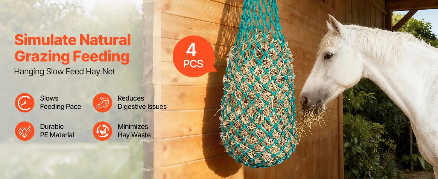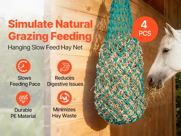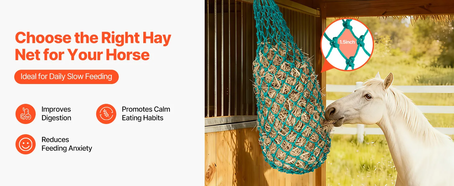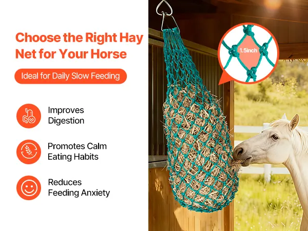 Dotate di una maglia da 1,5 pollici, queste reti per fieno a lenta alimentazione per cavalli sono adatte alla maggior parte dei cavalli per l'uso quotidiano, favorendo un'alimentazione graduale, riducendo lo spreco di fieno e favorendo una migliore digestione.