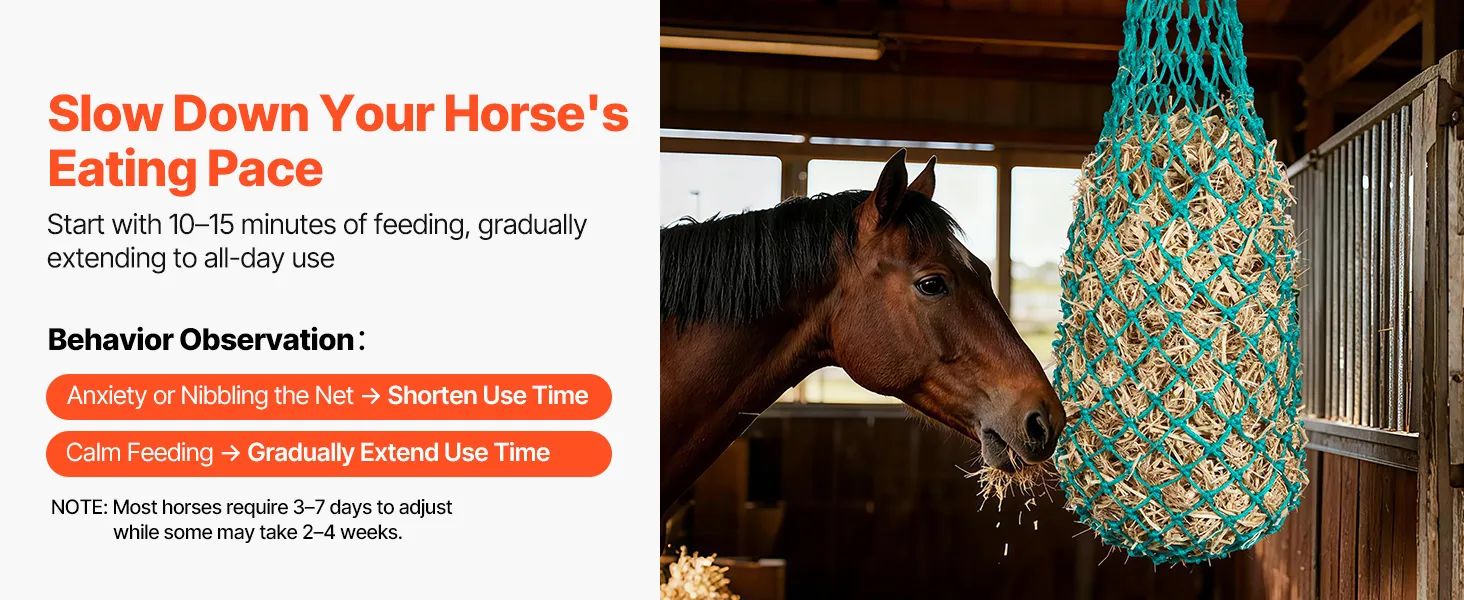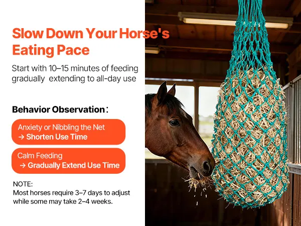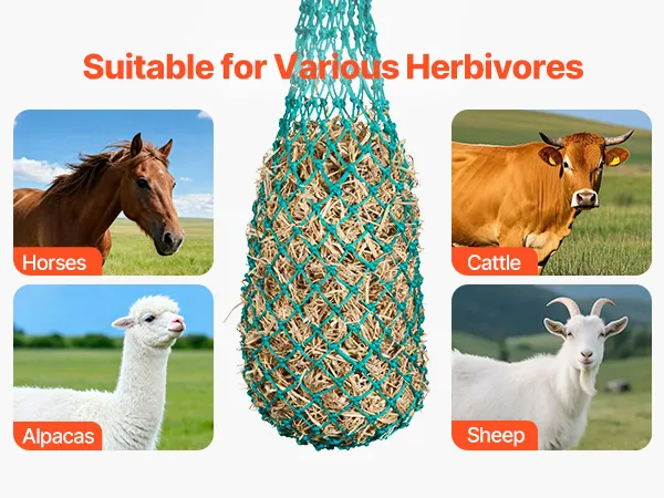 Ampia applicazione: le nostre reti per fieno a lenta alimentazione per cavalli sono ideali per stalle, paddock, aree di addestramento all'aperto e viaggi di alimentazione di breve durata. Sono adatte a cavalli, capre, alpaca e conigli