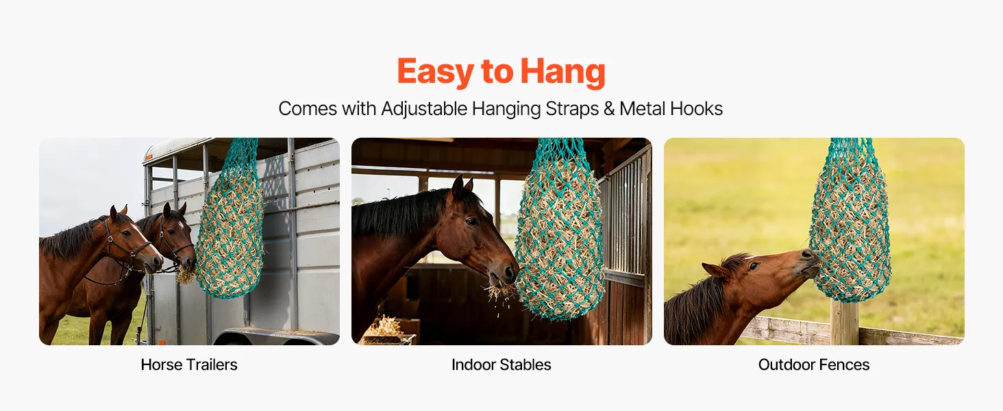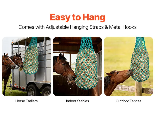 Adatte per uso interno ed esterno, queste reti per fieno per cavalli possono essere appese in modo rapido e sicuro a recinzioni, stalle o veicoli. Pratiche e portatili, consentono un'alimentazione flessibile in diversi ambienti.