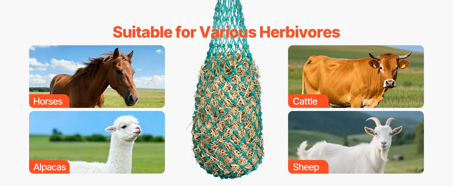 Queste reti per fieno a lenta alimentazione per cavalli sono progettate per grandi erbivori come cavalli, asini e muli, nonché per ruminanti di piccola e media taglia come pecore, mucche e cervi. Ideali per aziende agricole, stalle e ranch, soddisfano le diverse esigenze alimentari quotidiane.