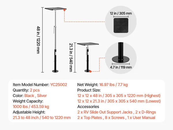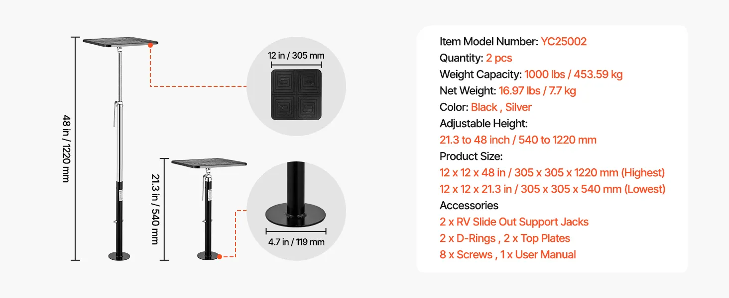 VEVOR Cric Sollevatore per SUV Camper 2 pezzi, Supporti in Acciaio Verniciato a Polvere per Camper, Capacità di Carico Fino a 453,59 kg, Altezza Regolabile da 541,02 a 1219,2 mm, Piede di Supporto
