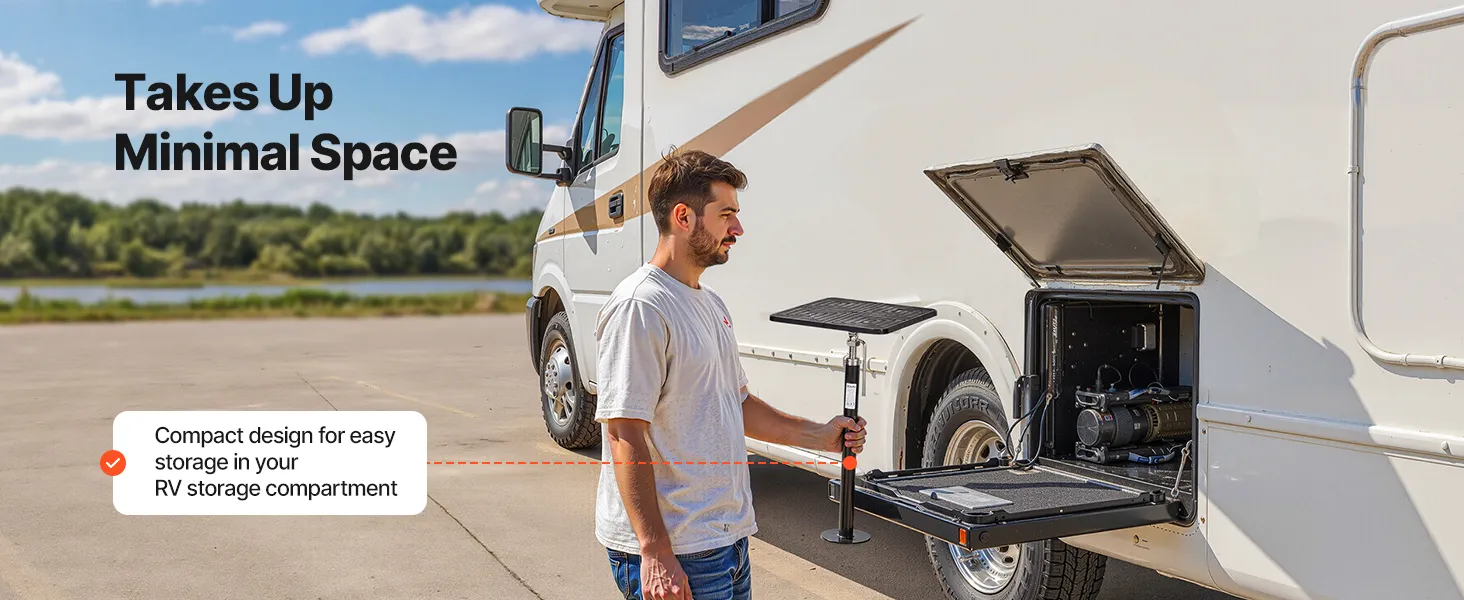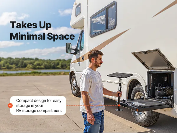 Compatibilità versatile: questo stabilizzatore per gradini è compatibile con vari modelli di camper, tra cui roulotte, camper pieghevoli e semirimorchi. Presenta dimensioni compatte di 305 x 305 x 540 mm (12,0 x 12,0 x 21,3 pollici)