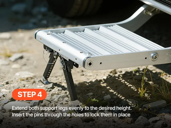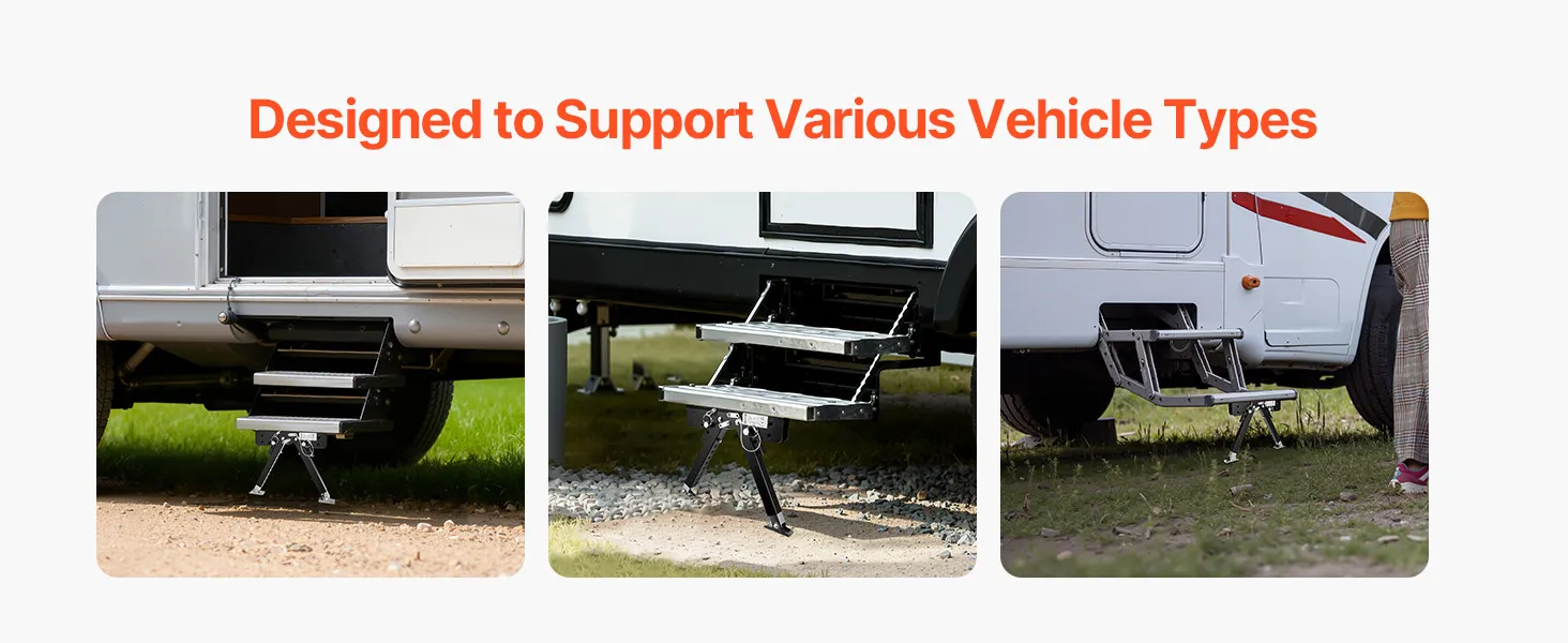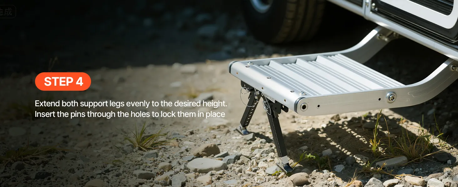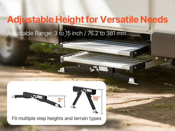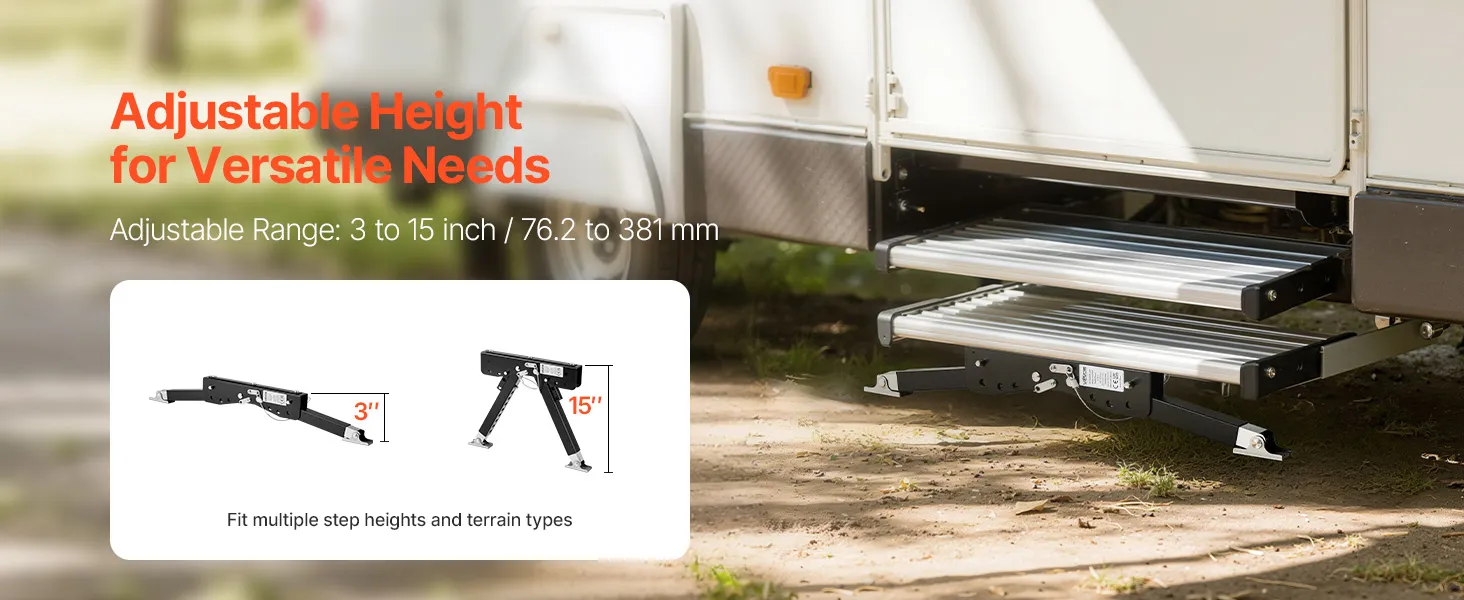Gradini regolabili in altezza: grazie al robusto stabilizzatore per gradini per camper, l'altezza dei gradini può essere facilmente regolata in base alle diverse superfici. L'intervallo di regolazione è compreso tra 76,2 e 381 mm