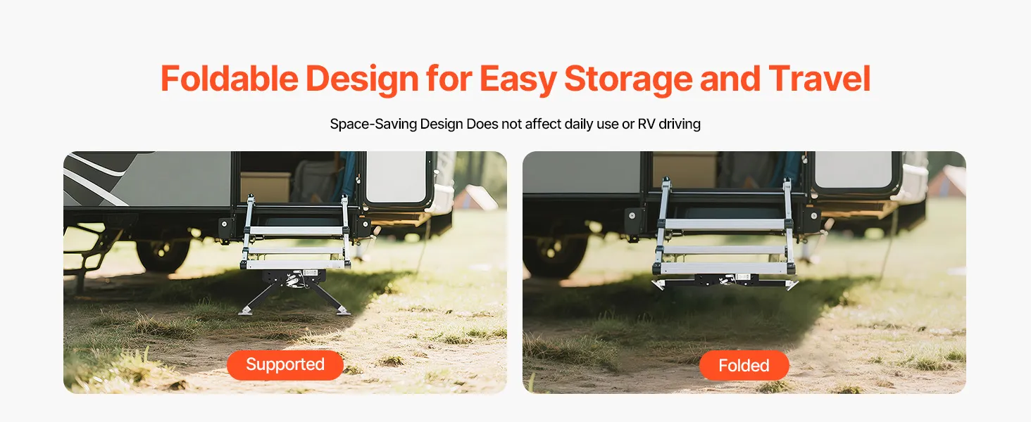 Design compatto e pieghevole: una volta saliti a bordo, il gradino può essere facilmente riposto sotto il gradino. Il design salvaspazio non limita i movimenti e consente un facile stoccaggio. Questo gradino per camper è un compagno affidabile