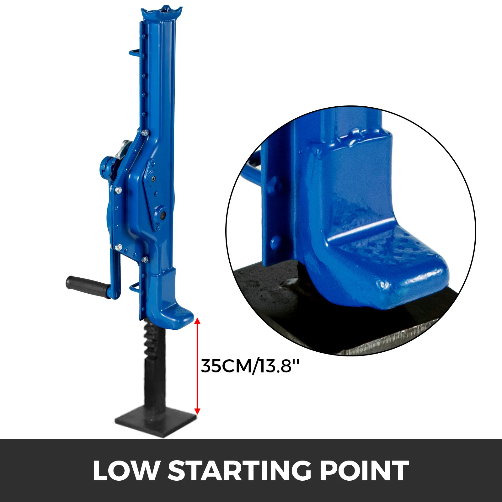 Questo martinetto agricolo, con un alloggiamento auto-sollevante, è caratterizzato da un'elevata resistenza al carico, una posizione sicura assicurata dalla grande piastra di base. La sua sicurezza grazie alle doppie lame di bloccaggio e alla manovella pieghevole. Per garantire una presa sicura, il carico è sulla testa.