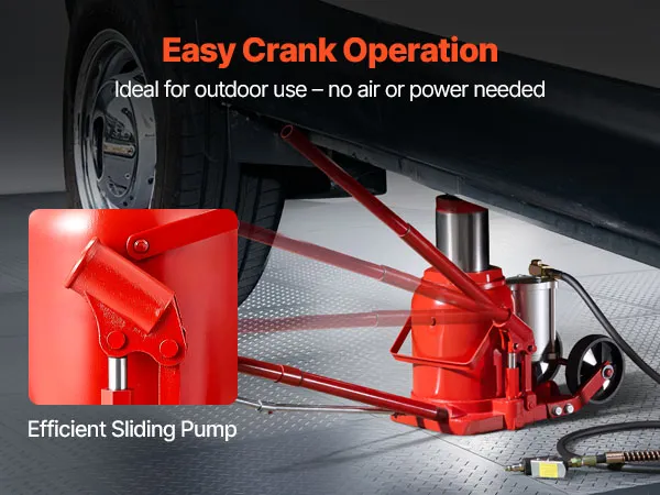 Questo cric idraulico a bottiglia, manuale e pneumatico, sfrutta la forza idraulica per sollevare fino a 50 tonnellate con stabilità. È ideale per lavori pesanti come riparazioni di veicoli o manutenzione domestica su furgoni, camper e SUV.