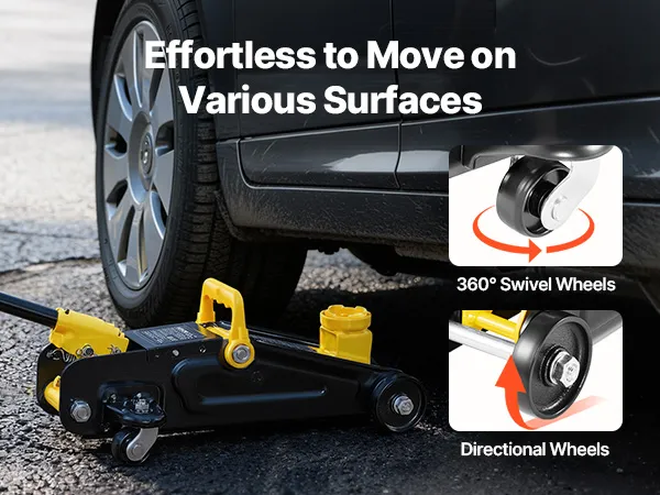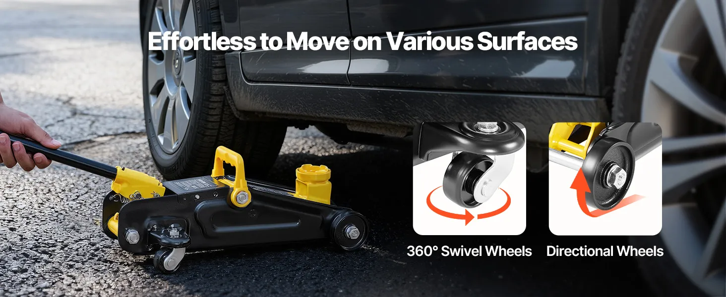 Mobilità a 360°: il cric a basso profilo è dotato di una maniglia antiscivolo con due ruote girevoli e due ruote direzionali. Si muove agevolmente sull'asfalto esterno, consentendo di posizionarlo sotto il veicolo senza sforzo
