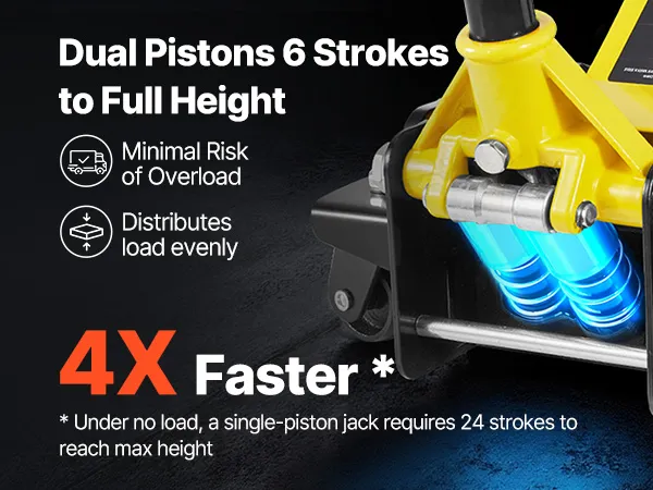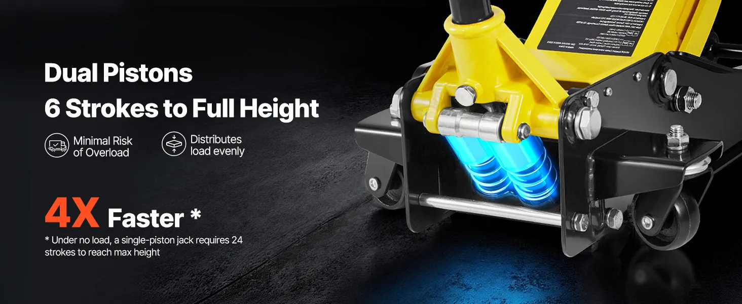 Sollevamento rapido a doppio pistone: il nostro cric idraulico da pavimento utilizza un sistema idraulico a doppio pistone, raggiungendo l'altezza massima in sole sei pompate a vuoto, 4 volte più velocemente rispetto ai cric a singolo pistone
