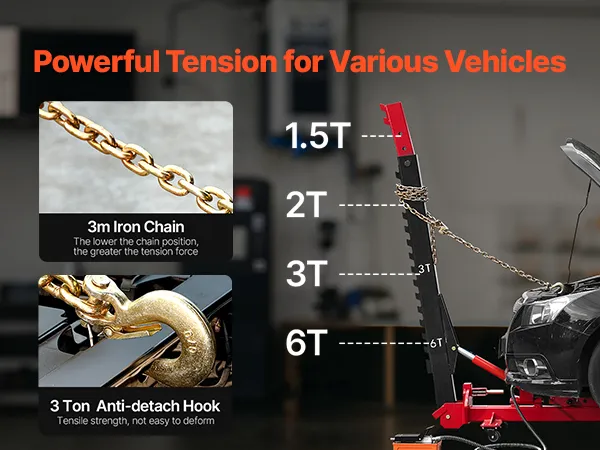 Questo estrattore per carrozzeria è dotato di una catena ad alta resistenza da 3 m e di un gancio anti-distacco da 3 tonnellate. La forza di trazione massima può raggiungere le 6 tonnellate, con una forza di trazione che aumenta tirando la catena verso il basso.
