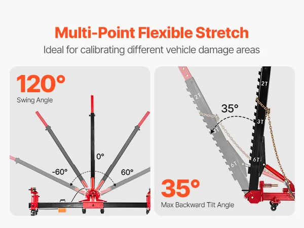 Palo regolabile flessibile: il palo dell'estrattore per telai automobilistici oscilla da -60° a +60° e si inclina fino a 35°, offrendo regolazioni precise e stabilità grazie al suo design a 8 perni