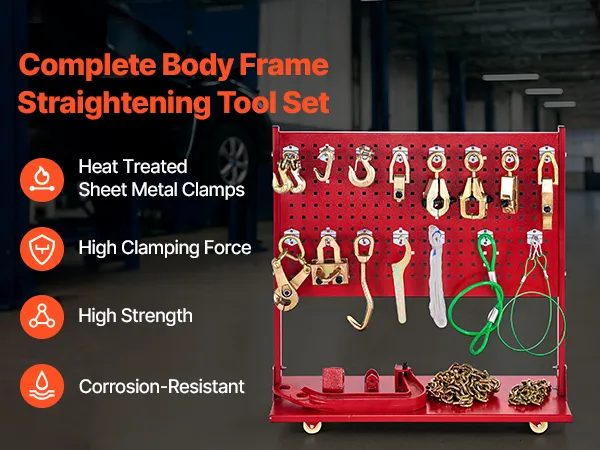 Kit di raddrizzatura da 16 pezzi: il nostro raddrizza-telaio per carrozzeria è dotato di morsetti per lamiera e utensili essenziali per la riparazione della carrozzeria. Un morsetto di fissaggio a doppia testa garantisce un serraggio robusto e stabile per la sicurezza durante la raddrizzatura