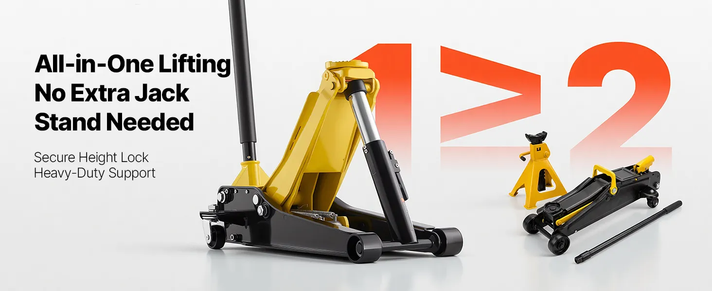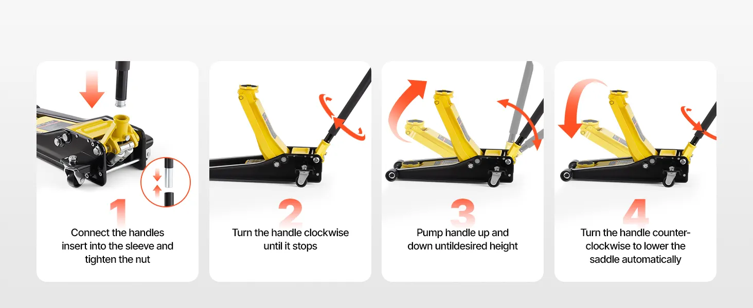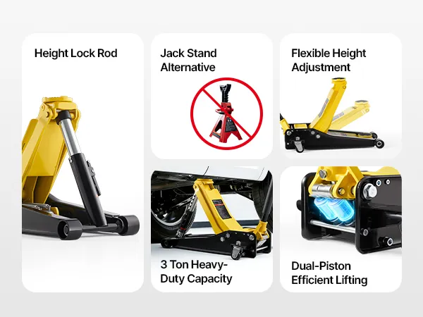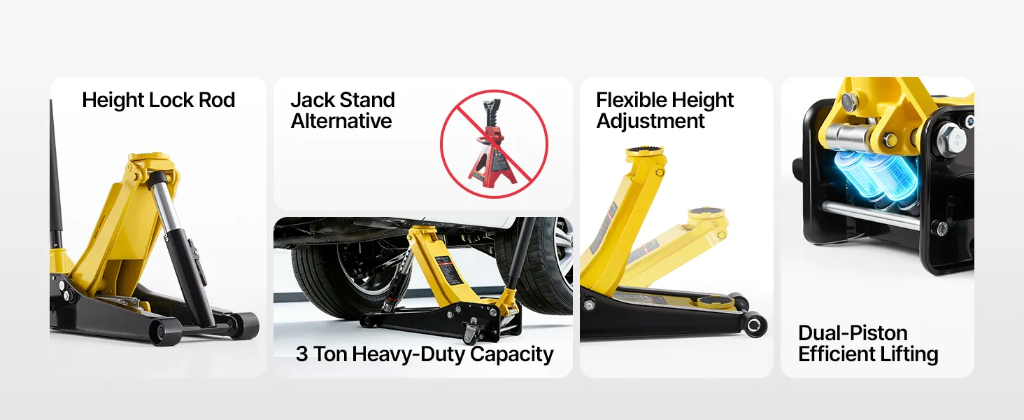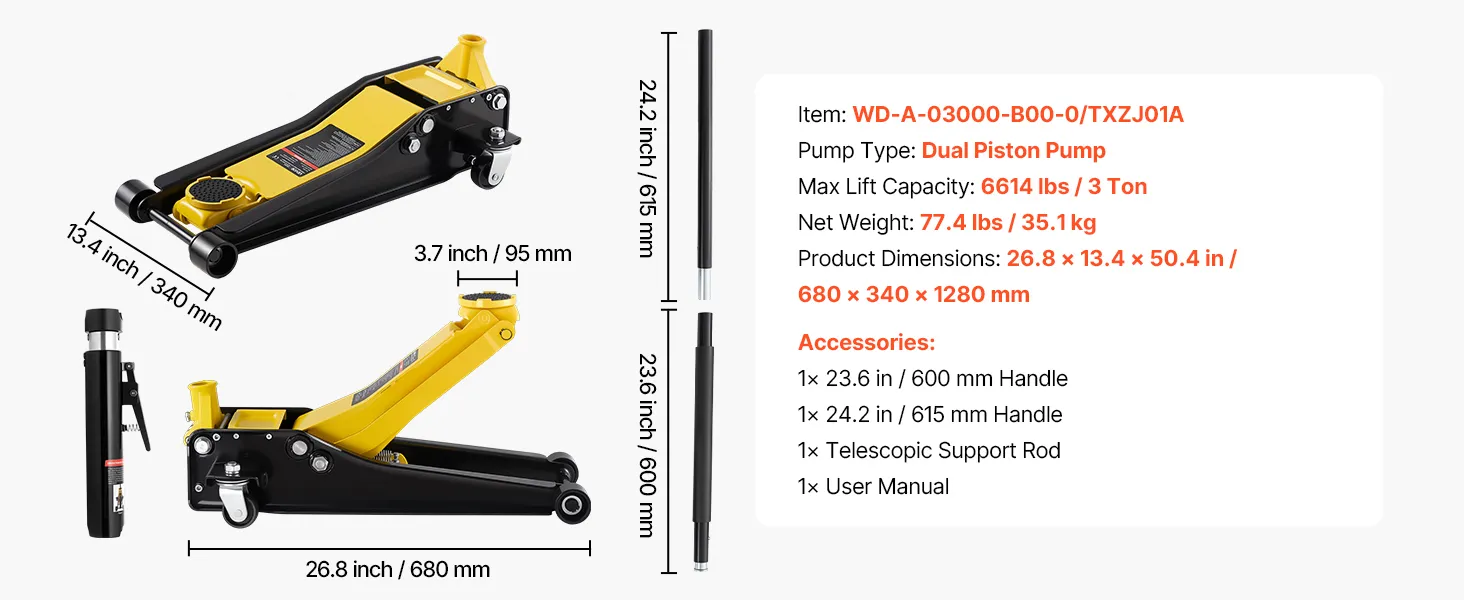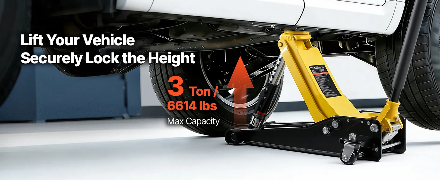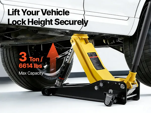 Capacità massima di 3 tonnellate: Il nostro cric idraulico da pavimento supporta fino a 3 tonnellate, sollevando facilmente auto sportive, berline, SUV e pick-up. È ideale per il cambio pneumatici, la manutenzione dei freni, la sostituzione dello scarico, la manutenzione delle sospensioni e altri lavori sul telaio