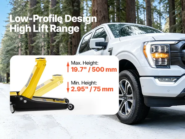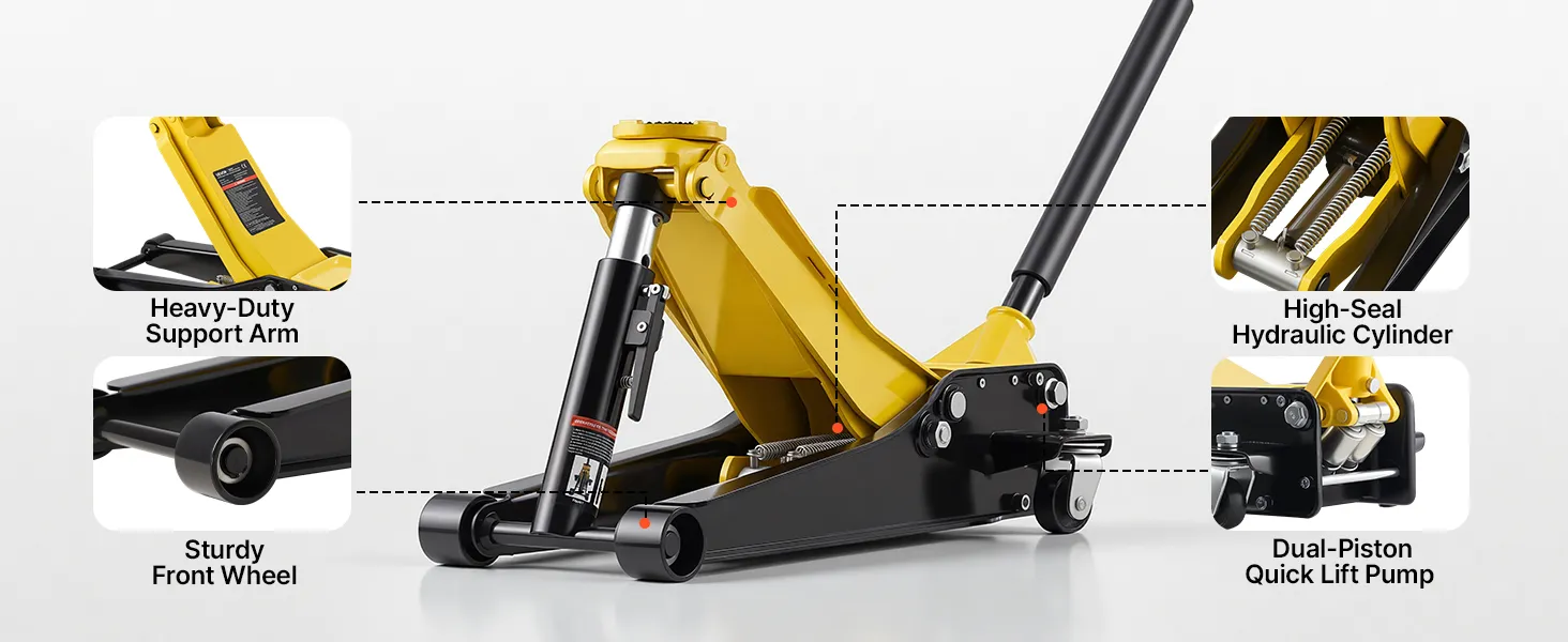Questo cric a pavimento a basso profilo è dotato di un sistema idraulico sigillato per prestazioni affidabili. La tenuta stagna aiuta a ridurre al minimo le perdite d'olio e a mantenere una potenza di sollevamento costante anche durante l'uso prolungato.