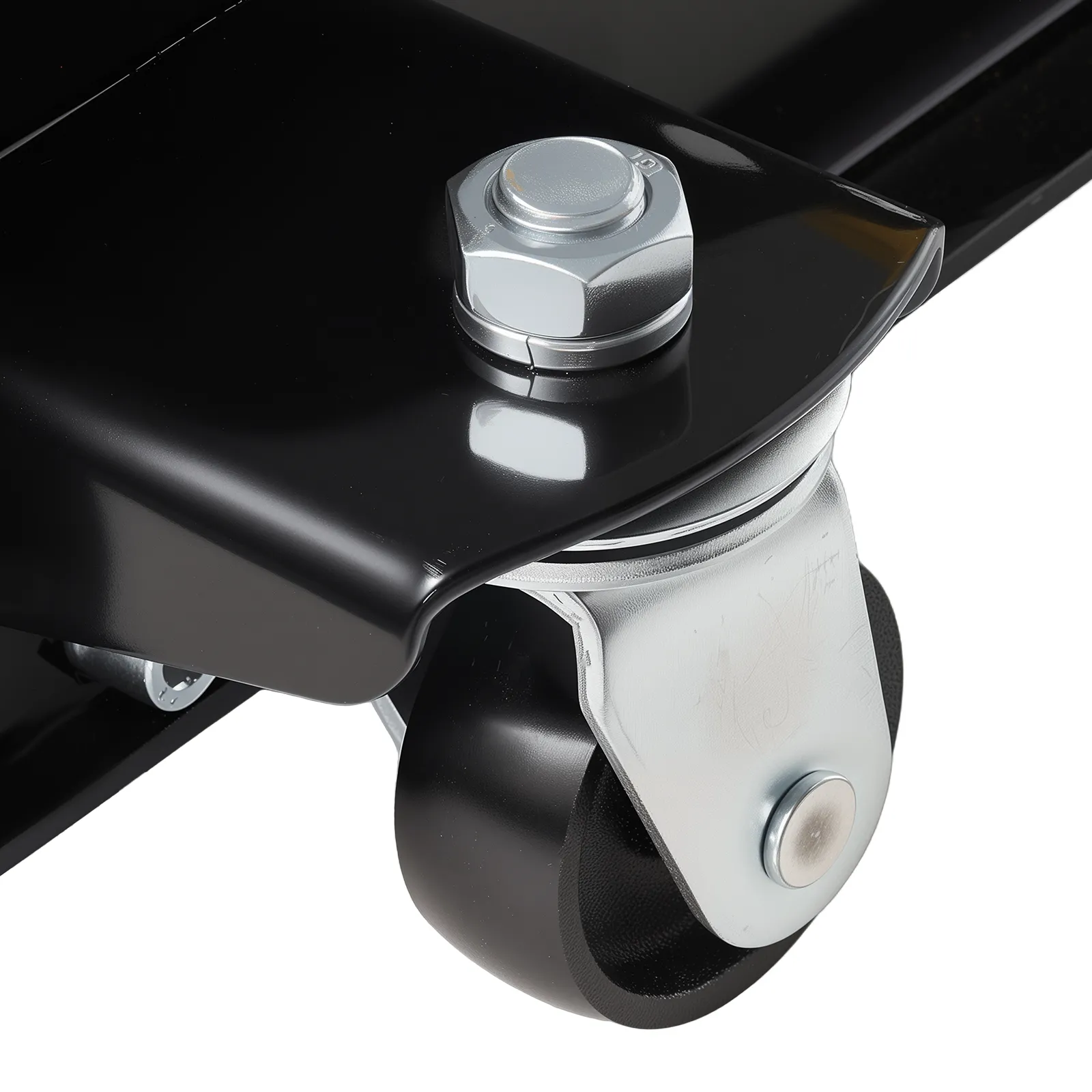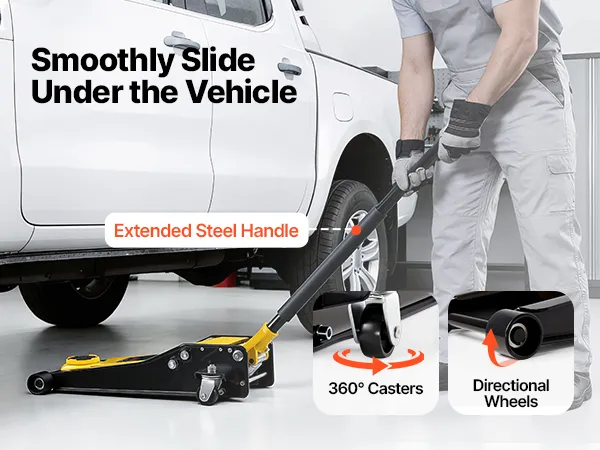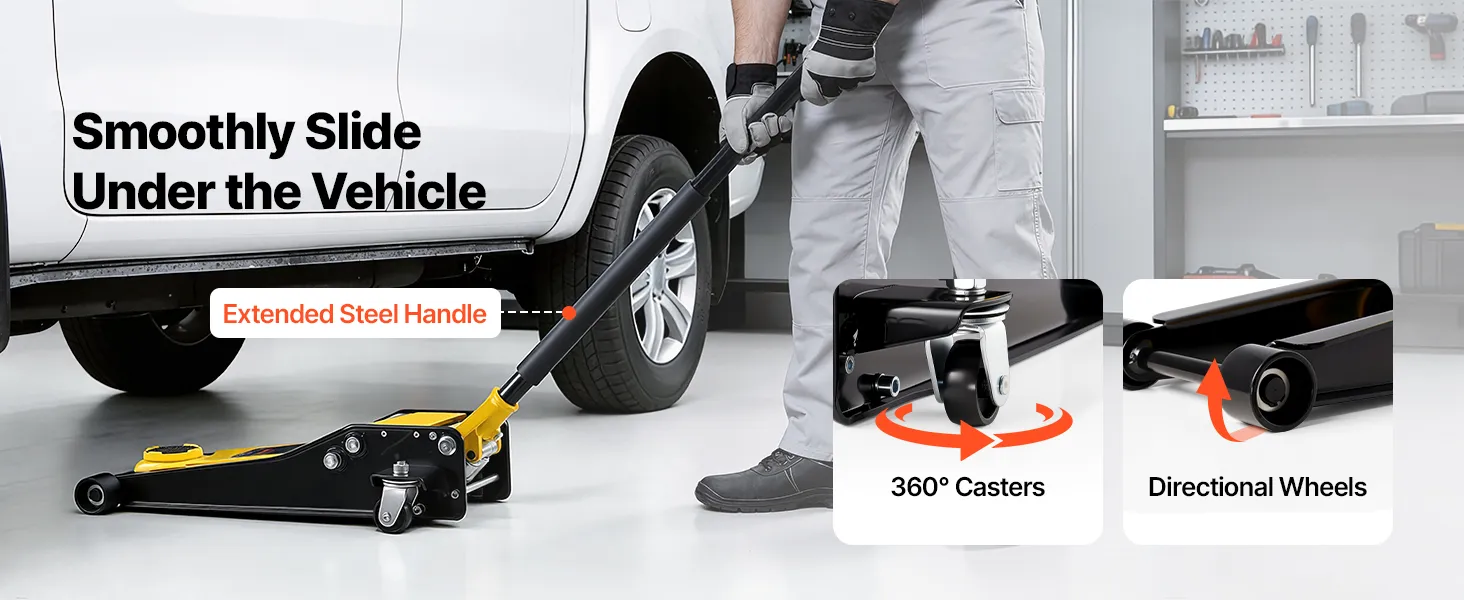 Mobilità fluida a 360°: Questo cric a basso profilo è dotato di una maniglia estesa per un migliore controllo. Due ruote girevoli e due ruote fisse aiutano il cric a muoversi agevolmente sull'asfalto esterno e a scivolare facilmente sotto il veicolo con meno sforzo