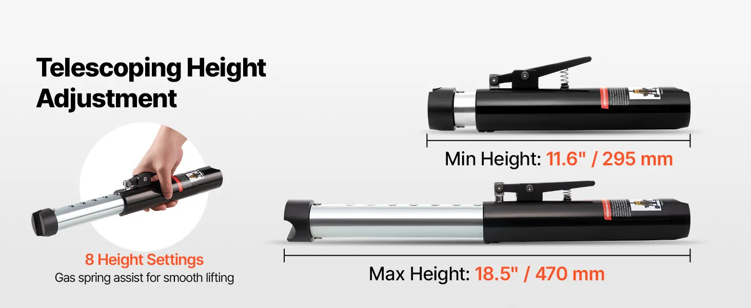 Kit cric da pavimento e asta di supporto: Il nostro cric da pavimento a basso profilo include un'asta di supporto telescopica, con 8 impostazioni di altezza (da 295 a 470 mm). Funge da supporto, consentendo al cric di rimanere bloccato in altezza mentre si lavora in sicurezza sotto il veicolo