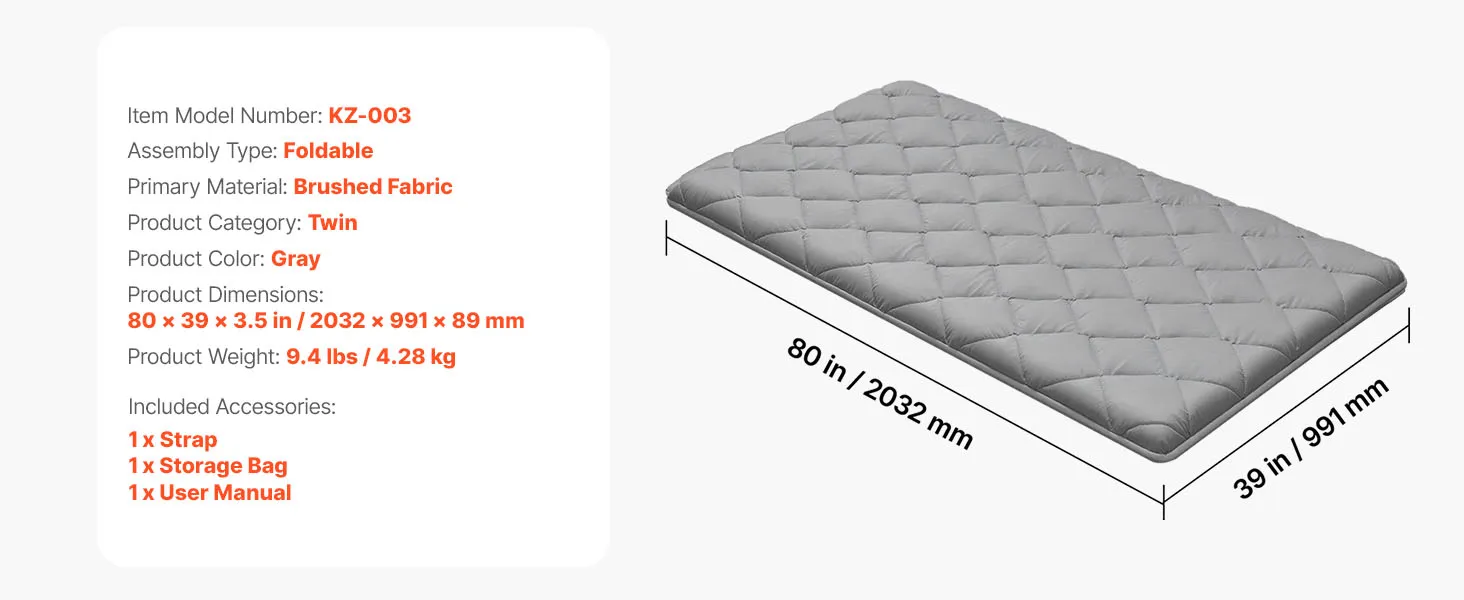 VEVOR Materasso Futon Giapponese da 2032 x 991 x 89 mm, Tatami Pieghevole Misura Letto Singolo, con Borsa Portaoggetti e Accessori di Montaggio, Materassino a 9 Strati per Meditazione Yoga, Grigio