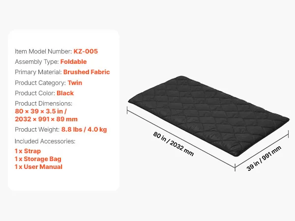 VEVOR Materasso Futon Giapponese da 2032 x 991 x 89 mm, Tatami Pieghevole Misura Letto Singolo, con Borsa Portaoggetti e Accessori di Montaggio, Materassino a 9 Strati per Meditazione Yoga, Nero