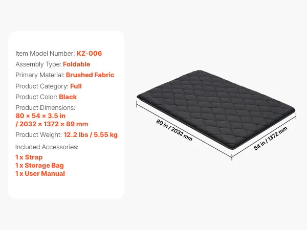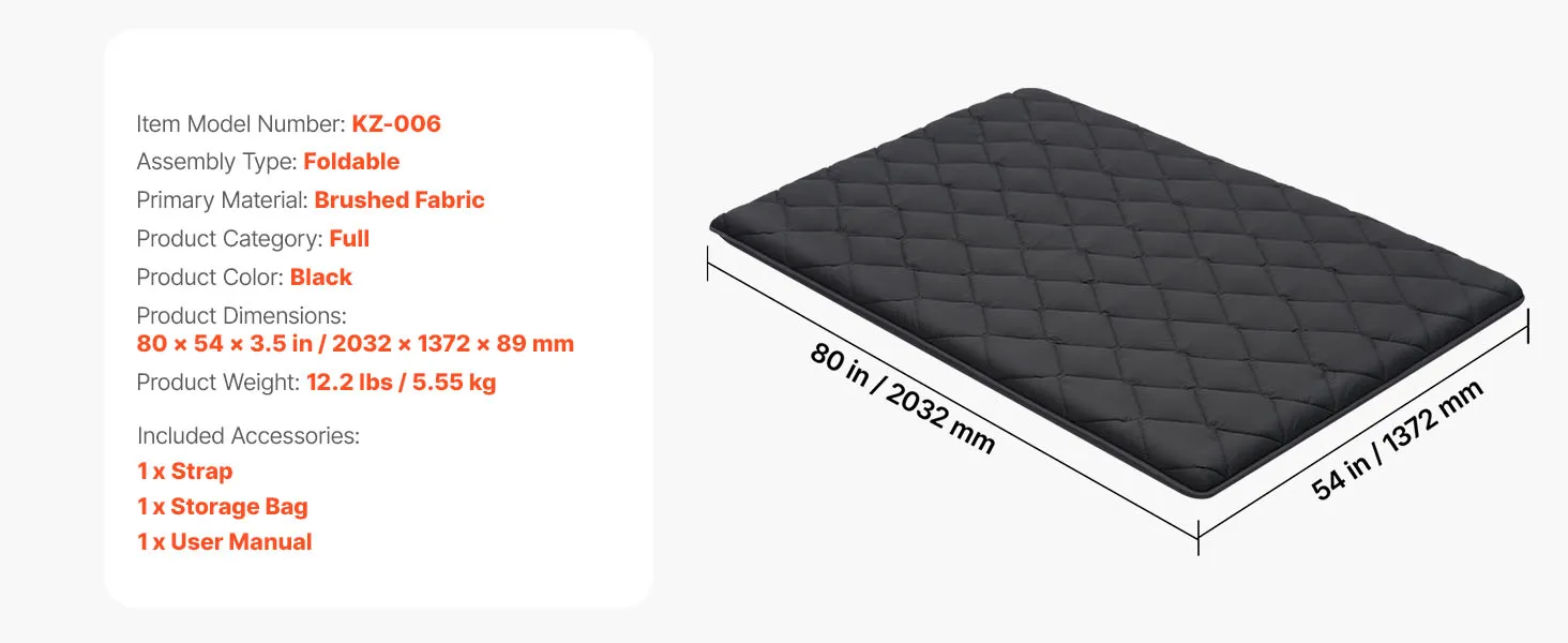VEVOR Materasso Tatami Addensato da 2032 x 1372 x 89 mm, Tatami Pieghevole Dimensioni Standard, con Borsa Portaoggetti e Accessori di Montaggio, Materassino a 9 Strati per Meditazione Yoga, Nero