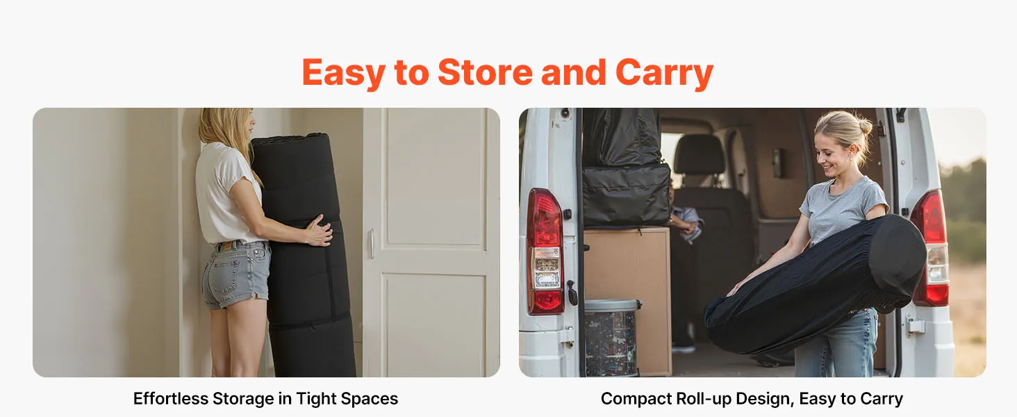 Facile da riporre e trasportare: il materasso giapponese da pavimento si arrotola e si fissa con delle cinghie per risparmiare spazio nell'armadio. È inclusa una borsa per il trasporto, così puoi rilassarti comodamente in tenda