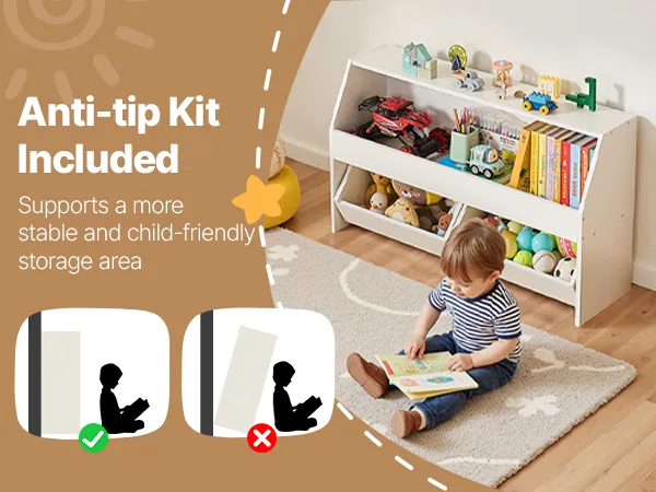 Design sicuro: robusto e affidabile. Questo mobiletto portagiochi è dotato di un dispositivo antiribaltamento che impedisce il ribaltamento durante l'uso, garantendo così una maggiore sicurezza