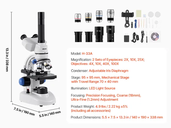 VEVOR Microscopio Trinoculare, Kit Microscopio Composto con Ingrandimento 40-5000X, Corpo in Lega di Alluminio, Illuminazione a LED Supporto per Telefono Inclusi, per Laboratorio, Scuola