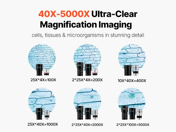 Immagini con ingrandimento ultra nitido: dotato di oculari WF10X e WF25X, nonché di obiettivi 4X/10X/40X, questo microscopio offre un intervallo di ingrandimento da 40X a 5000X, ideale per l'osservazione di strutture cellulari, campioni di tessuto