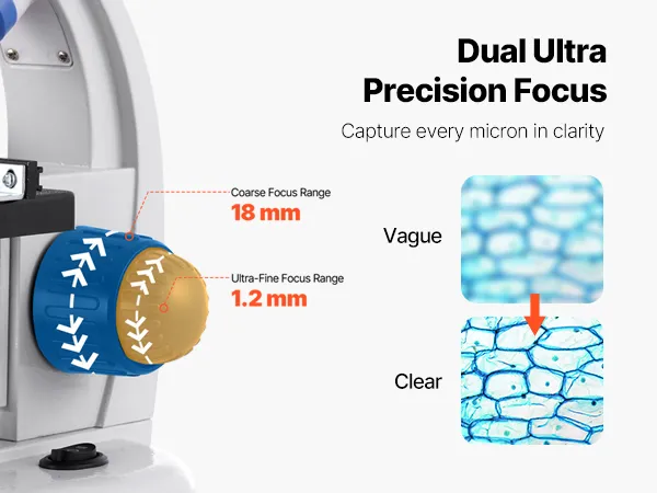 Messa a fuoco fluida ed efficiente: passa facilmente da un'immagine sfocata a un'immagine nitida con la messa a fuoco macrometrica da 15 mm. Doppia regolazione coassiale macro e micrometrica: dotato di due manopole per la messa a fuoco macrometrica (18 mm) e la messa a fuoco micrometrica (1,2 mm)