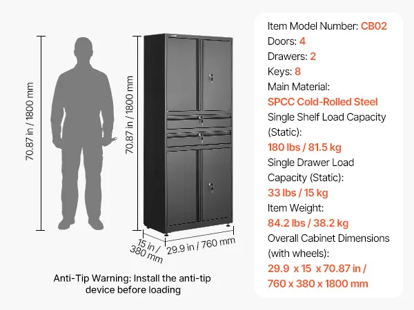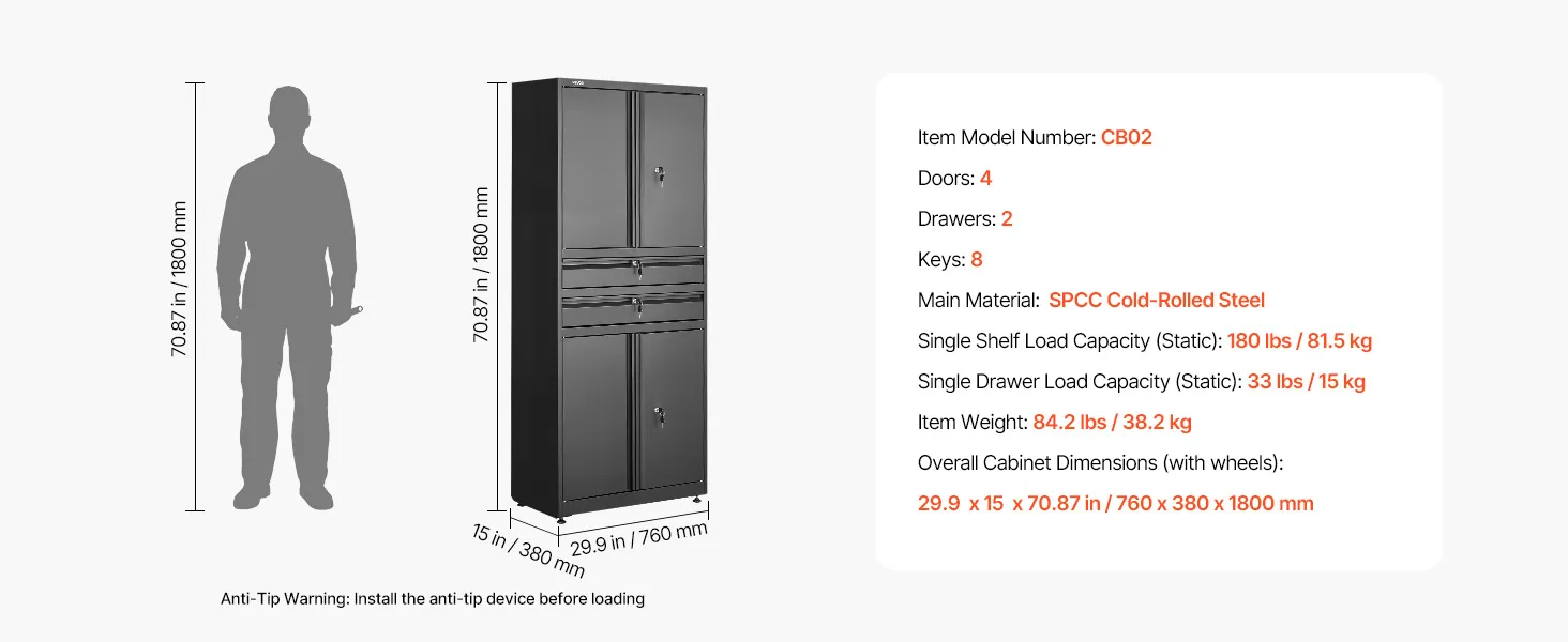 Spazio di archiviazione ampio e ben organizzato: Questo armadio in metallo è dotato di 4 ante e 2 cassetti e misura 760 x 380 x 1800 mm (29,9 x 15 x 70,87 pollici). I cassetti profondi possono contenere utensili elettrici, cassette degli attrezzi, prodotti per la pulizia e documenti. Manuale d'uso chiaro incluso per un montaggio rapido e senza problemi