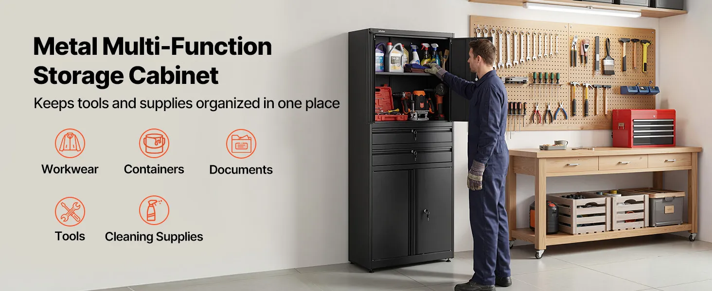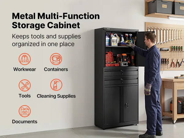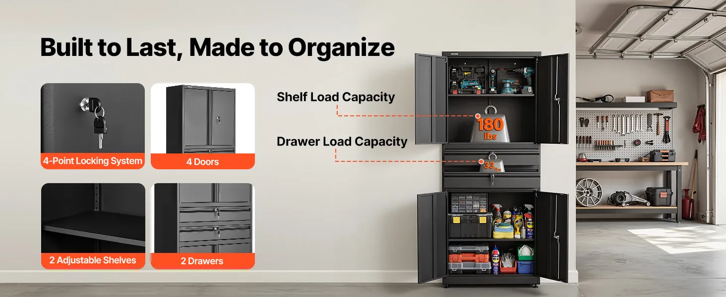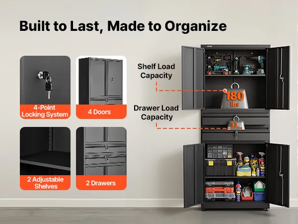 Elevata capacità di carico: Realizzato in acciaio resistente, questo armadio portaoggetti con serratura resiste alla flessione per un utilizzo prolungato. Ogni ripiano supporta fino a 81,5 kg e ogni cassetto fino a 15 kg. Ideale per riporre ferramenta pesante, utensili elettrici e per l'organizzazione quotidiana del garage.
