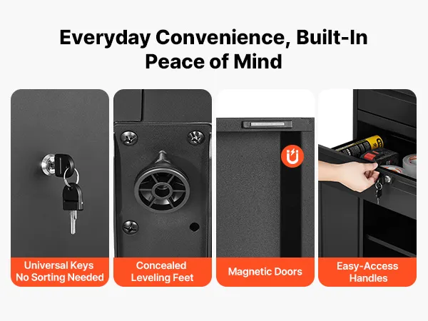 Piedini di livellamento a scomparsa, maniglie ergonomiche e chiusura sicura rendono questo armadio da garage in acciaio facilissimo da aprire, spostare e chiudere. Permette di prendere rapidamente gli attrezzi mantenendo gli oggetti di valore al sicuro per un utilizzo quotidiano.