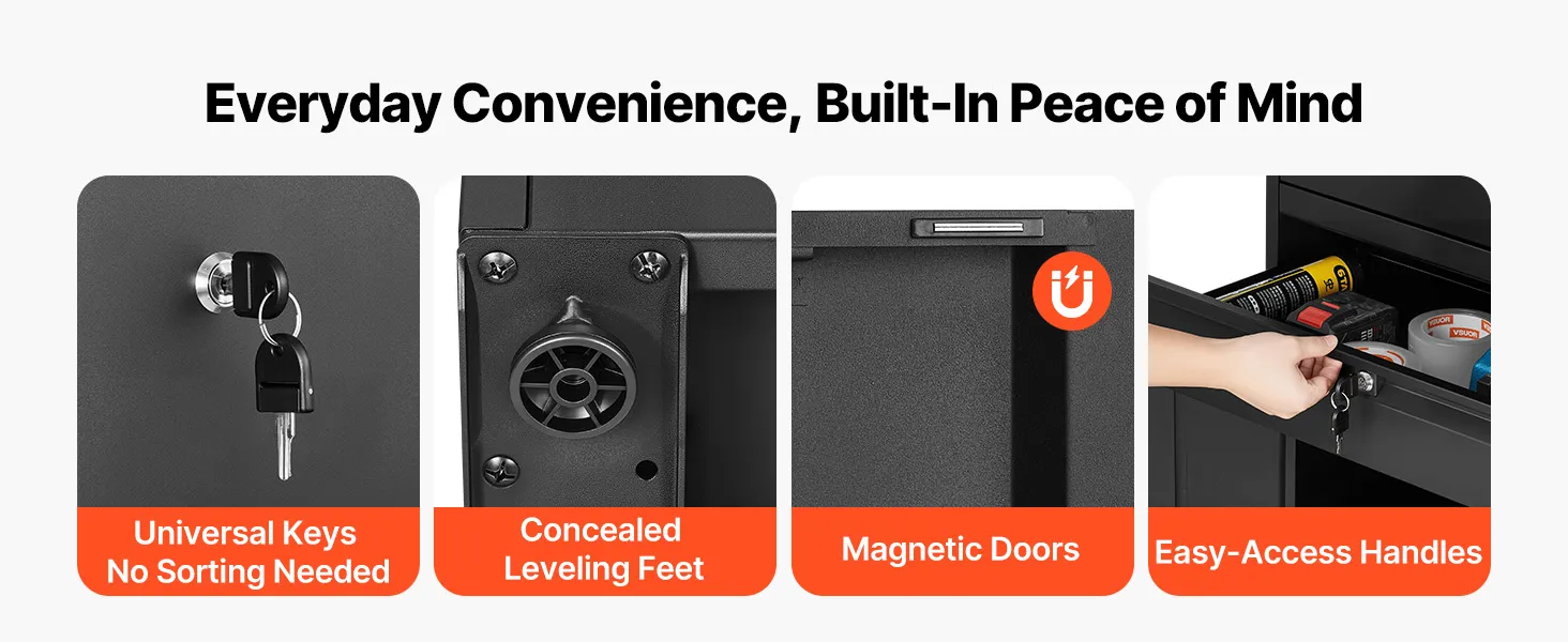 Livellamento nascosto per pavimenti irregolari: Questo armadio da garage in acciaio include piedini di livellamento nascosti per regolare con precisione l'altezza. Niente più oscillazioni. Rimani stabile su pavimenti irregolari di garage o officine, mantenendo un aspetto esterno pulito e ordinato
