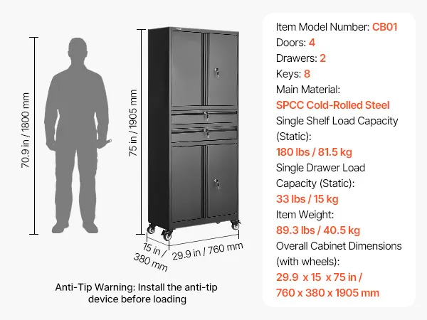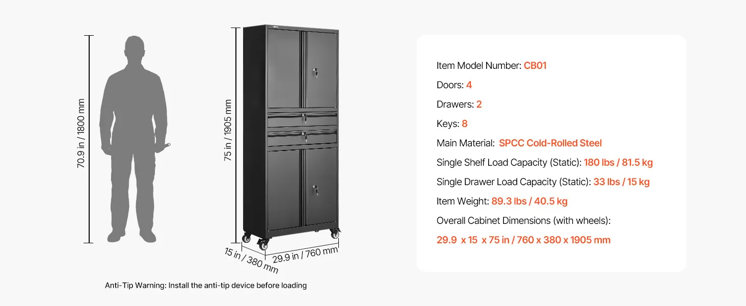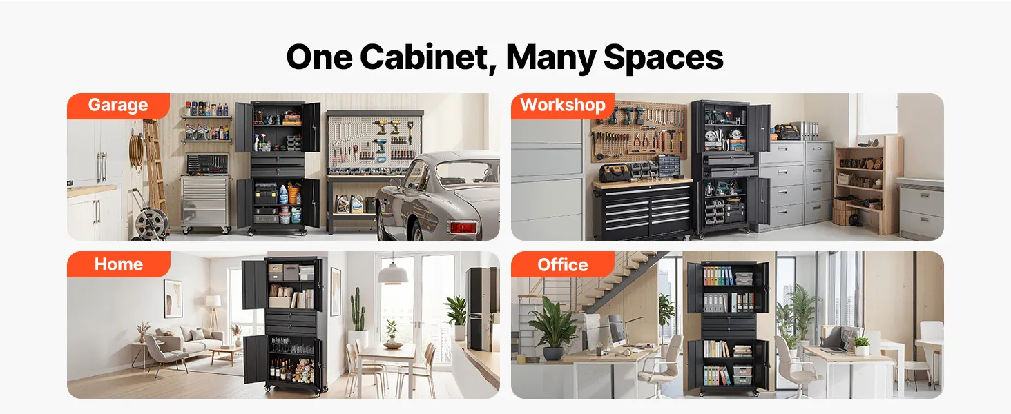 Spazio di archiviazione ampio e ben organizzato: Questo armadio in metallo è dotato di 4 ante e 2 cassetti e misura 760 x 380 x 1905 mm (29,9 x 15 x 75 pollici). I cassetti profondi possono contenere utensili elettrici, cassette degli attrezzi, prodotti per la pulizia e documenti. Manuale d'uso chiaro incluso per un montaggio rapido e senza problemi