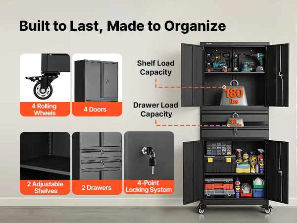 Elevata capacità di carico: Realizzato in acciaio resistente, questo armadio portaoggetti con serratura resiste alla flessione per un utilizzo prolungato. Ogni ripiano supporta fino a 81,5 kg e ogni cassetto fino a 15 kg. Ideale per riporre ferramenta pesante, utensili elettrici e per l'organizzazione quotidiana del garage