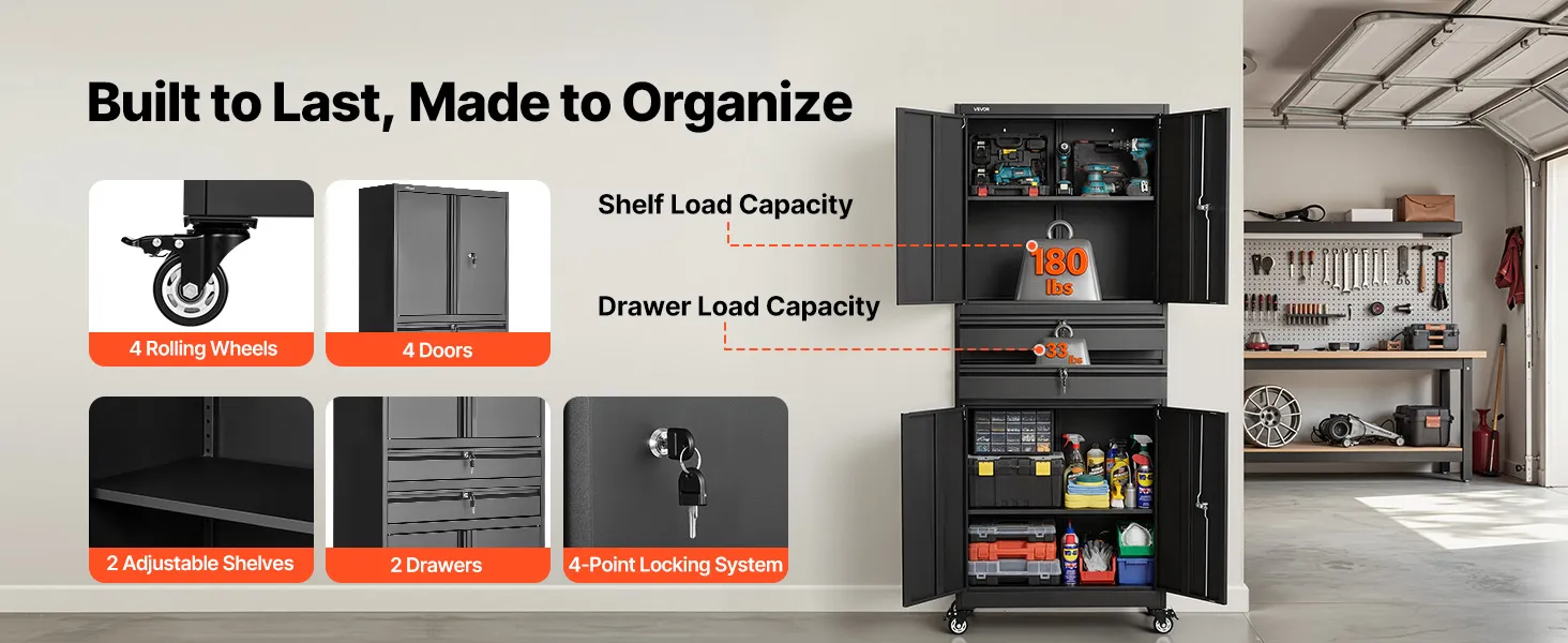 VEVOR Armadio Portaoggetti in Metallo con Ruote, Armadio Portautensili, Capacità di Carico per Ripiano 81,5 kg, Altezza 190,5 cm, 4 Ante con Serratura e Ripiani Regolabili, 2 Cassetti, per Garage Casa