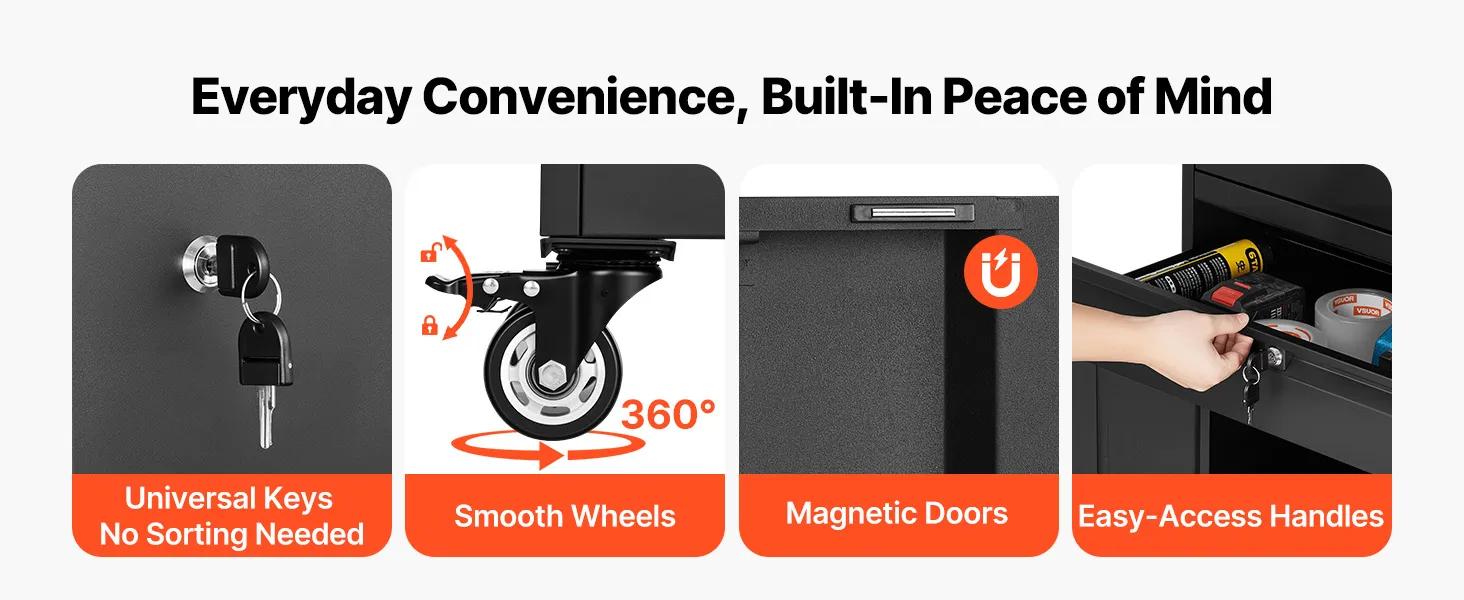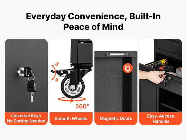 Le ruote scorrevoli, le maniglie facili da impugnare e la chiusura sicura rendono questo armadietto in acciaio estremamente facile da aprire, spostare e chiudere. Permette di prendere rapidamente gli attrezzi mantenendo gli oggetti di valore al sicuro per un utilizzo quotidiano.