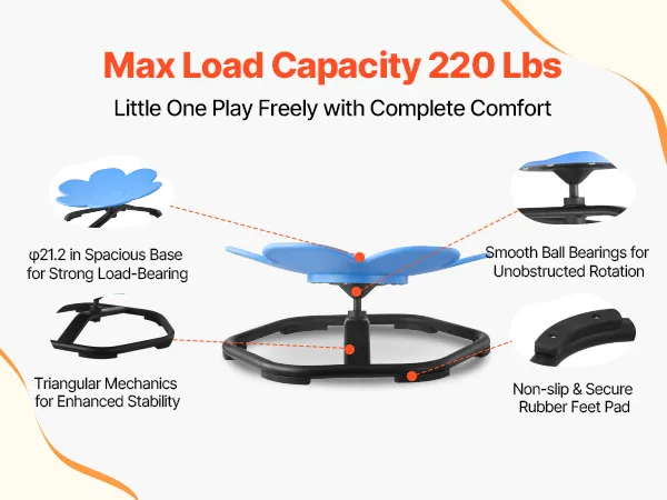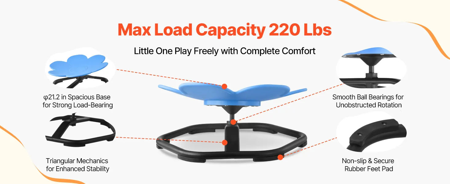 La sedia girevole per bambini con base in metallo allargata da 54 cm supporta fino a 100 kg. La sua struttura triangolare con cuscinetti a sfera garantisce una rotazione fluida e il design antiscivolo impedisce lo scivolamento durante il gioco.