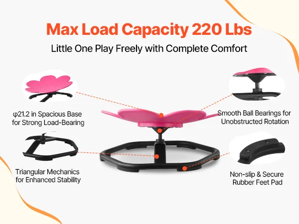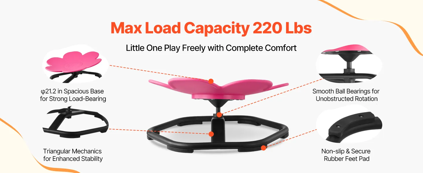 La sedia girevole per bambini con base in metallo allargata da 54 cm supporta fino a 100 kg. La sua struttura triangolare con cuscinetti a sfera garantisce una rotazione fluida e il design antiscivolo impedisce lo scivolamento durante il gioco.