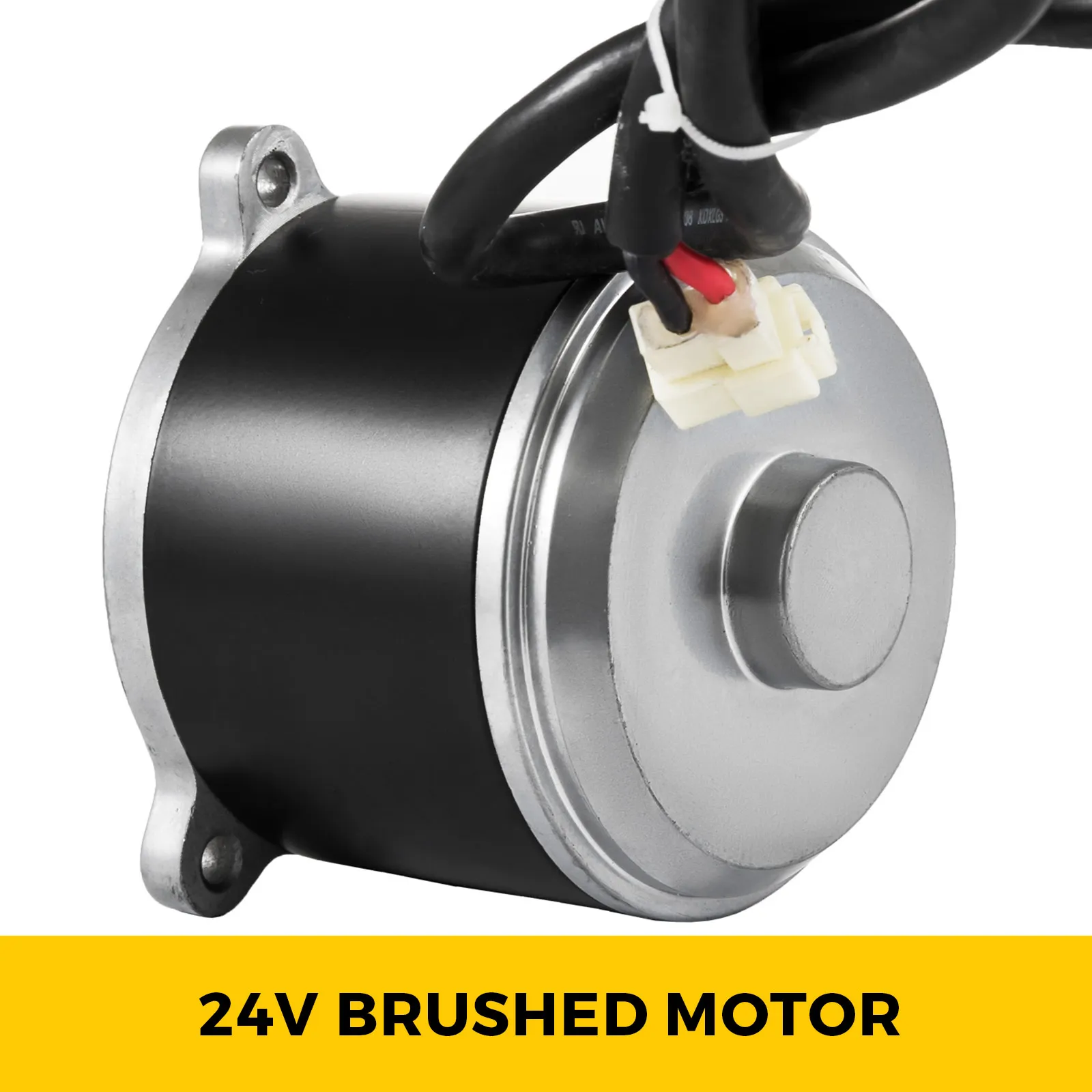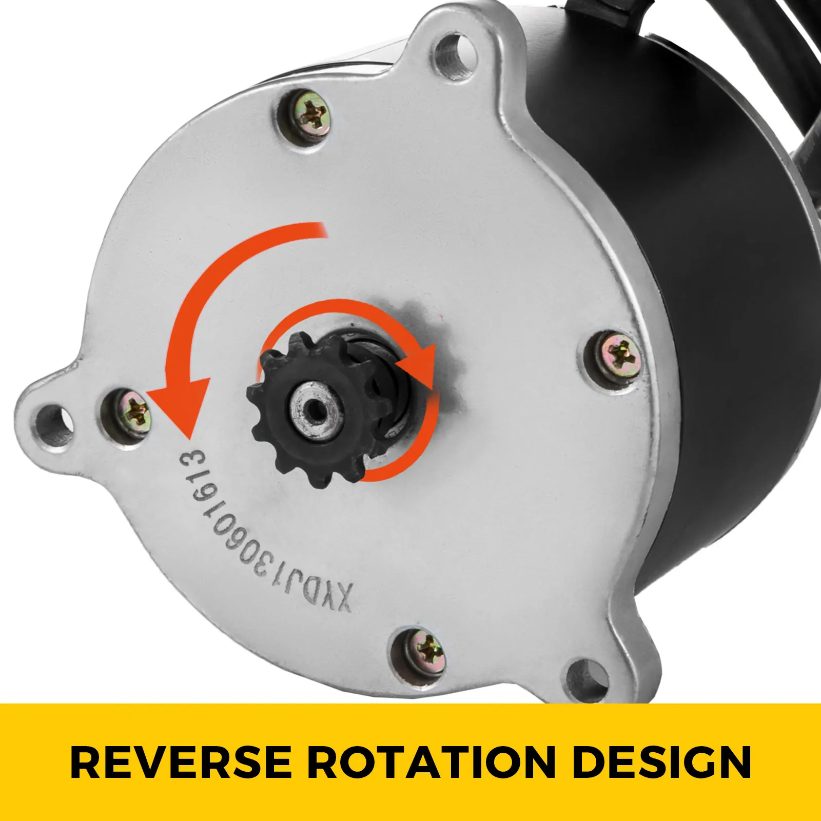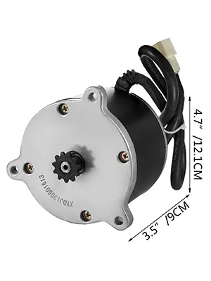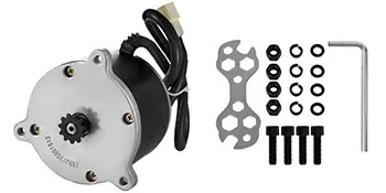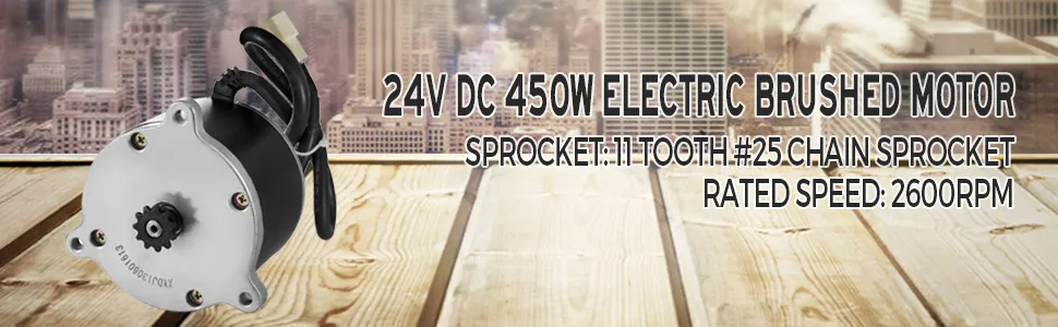 Questo potente motore elettrico è dotato di DC 24 Volt, uscita 450 Watt, velocità nominale 2600 giri/min, corrente nominale 18,75 Amp, trasmissione a catena (pignone 11 denti) la catena # 25 è il motore elettrico ideale per grandi scooter, bici e trike, Mini Bici quad e Go-kart, biciclette, ecc.