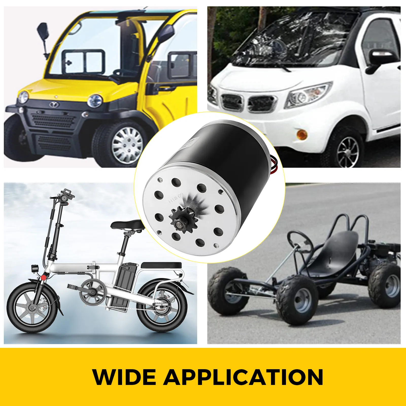 Questo potente motore elettrico è dotato di 36 Volt CC, uscita 800 Watt, velocità nominale 2800 giri / min, corrente nominale 28,5 Amp, trasmissione a catena (pignone da 11 denti) La catena n.25 è il motore elettrico ideale per scooter di grandi dimensioni, biciclette e trike, mini moto quad e Go-Kart, biciclette, ecc.
