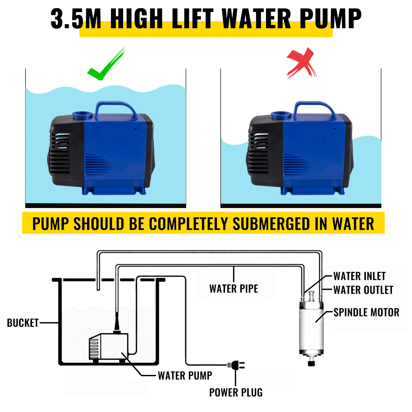 La pompa presenta i vantaggi di un sollevamento elevato, di una grande portata e di un eccellente isolamento. Dovrebbe essere completamente immerso in acqua per funzionare. Ti forniamo anche tubi dell'acqua per collegare la pompa dell'acqua al motore mandrino senza sforzo.