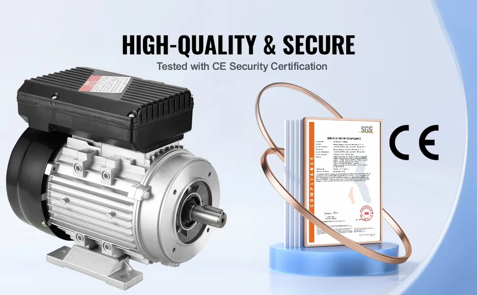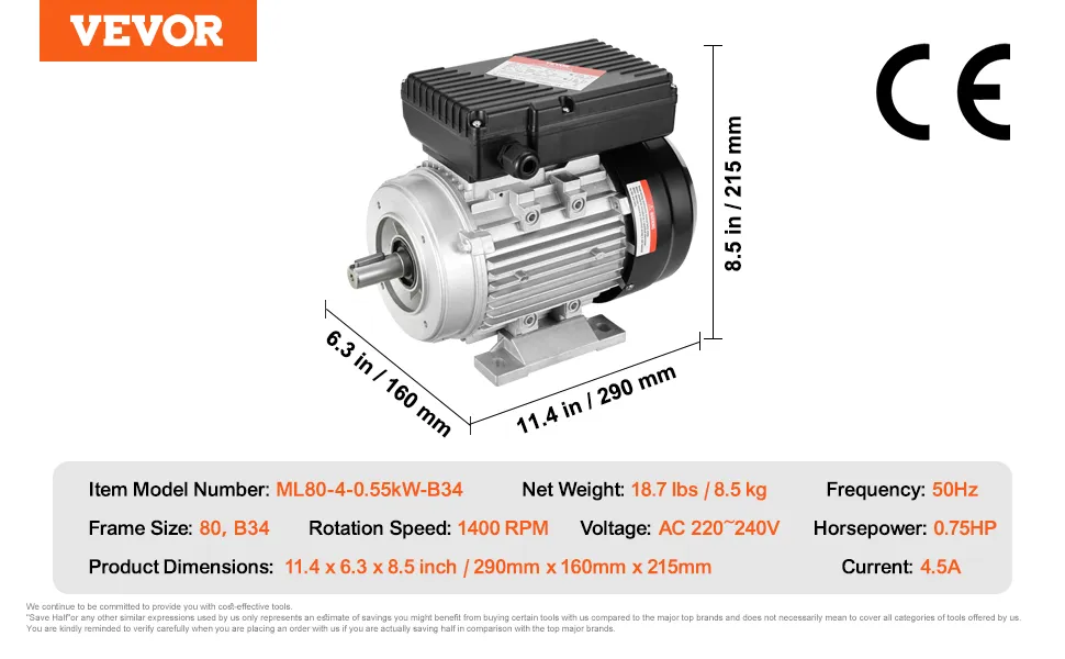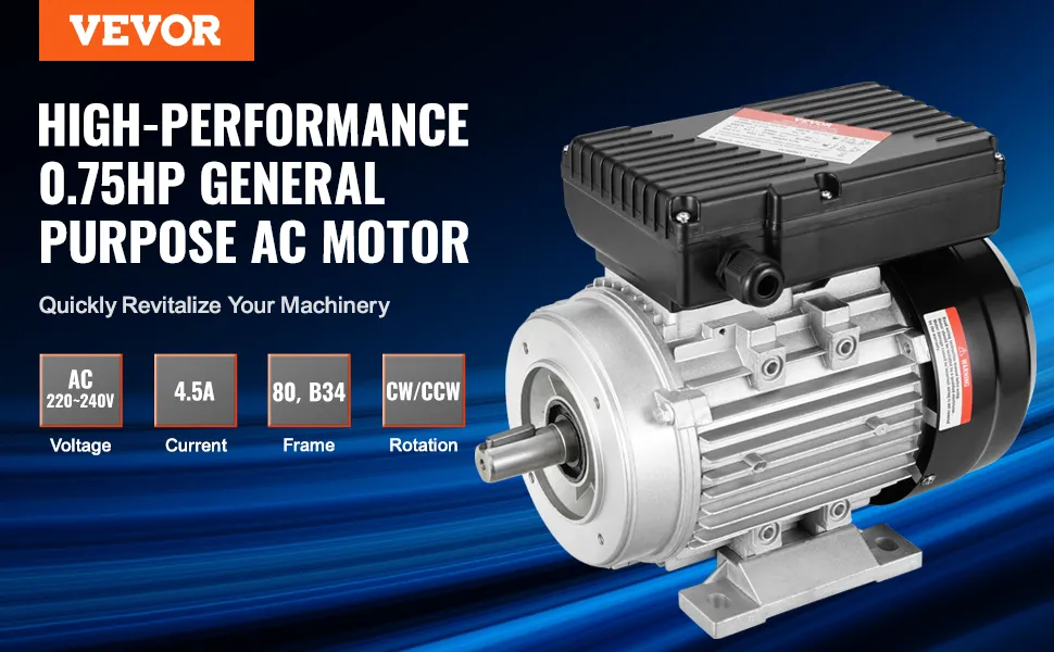 Dai prestazioni potenti alla tua attrezzatura con il motore elettrico VEVOR da 0,55KW. Funziona con tensione CA 220~240 V con corrente 4,5 A, è dotato di alta velocità di 1400 giri/min, telaio 80, B34, lunghezza dell'albero di 40 mm, albero con chiavetta di 19 mm.