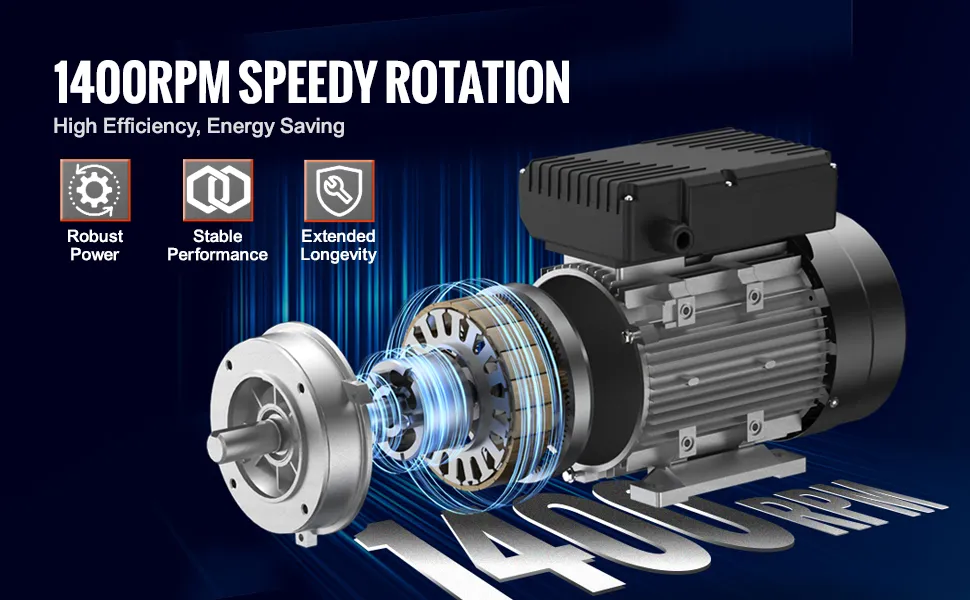 Il motore elettrico VEVOR da 0,55KW vanta un'alta velocità di 1400 giri/min, offrendo prestazioni potenti in varie applicazioni. La sua robusta potenza erogata garantisce un funzionamento efficiente, rendendolo ideale per macchine agricole e attrezzature industriali.