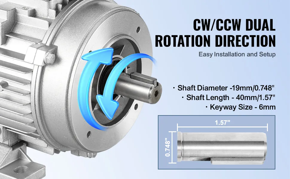 Dotato di doppia direzione di rotazione CW/CCW, questo motore del compressore d'aria è facile da installare e facile da usare. Con un diametro dell'albero di 19 mm, una lunghezza dell'albero di 40 mm e una chiavetta da 6 mm, si collega facilmente a diverse apparecchiature.