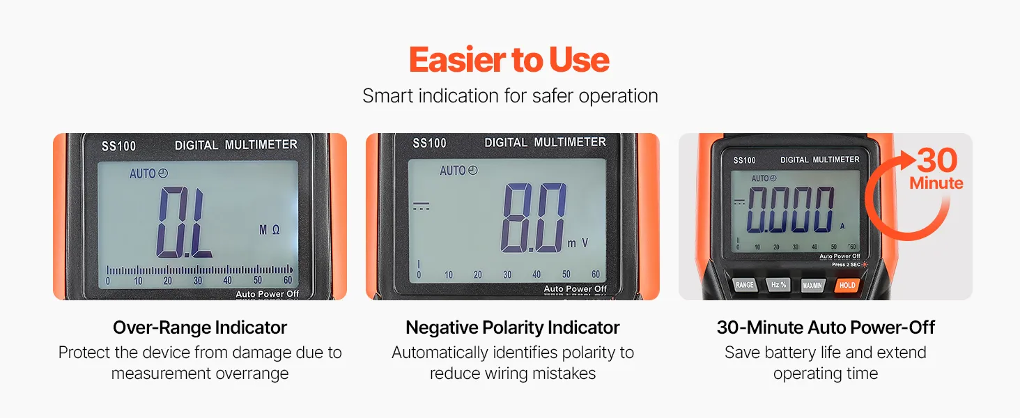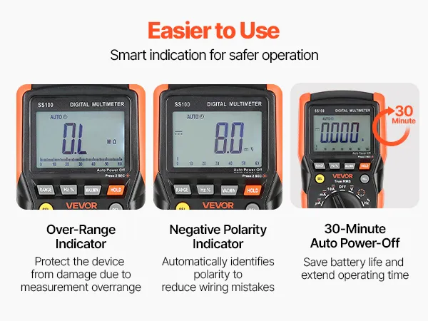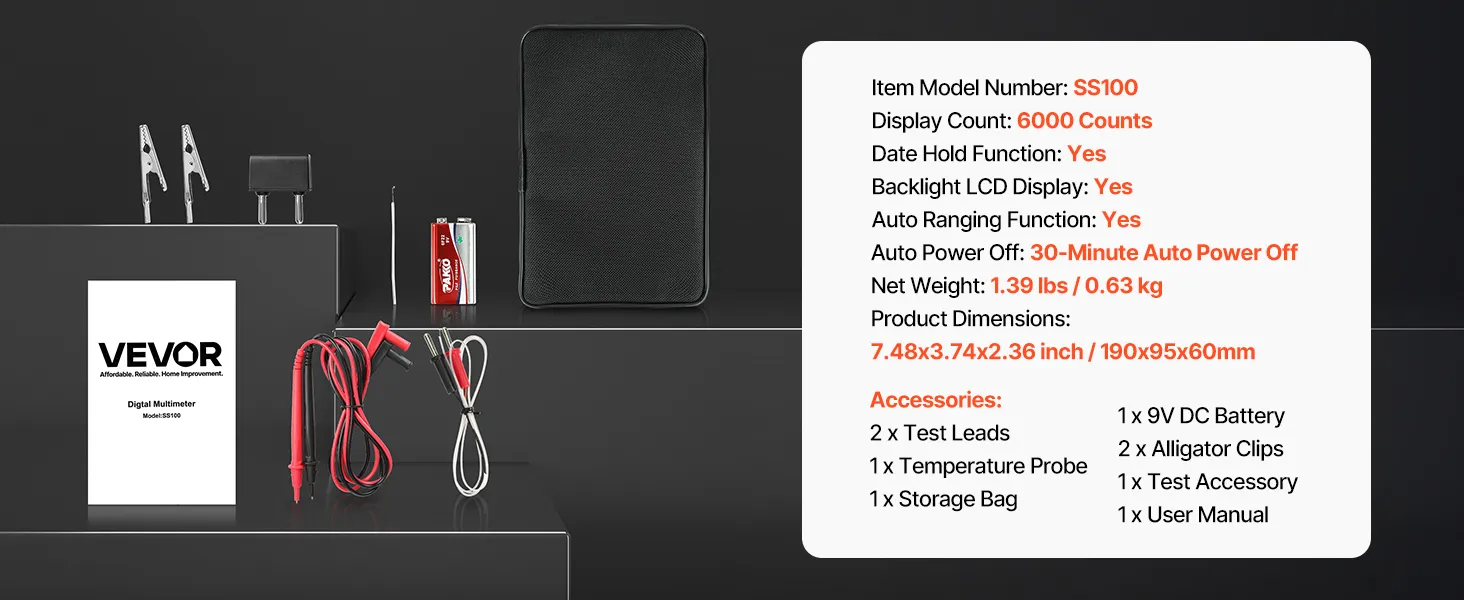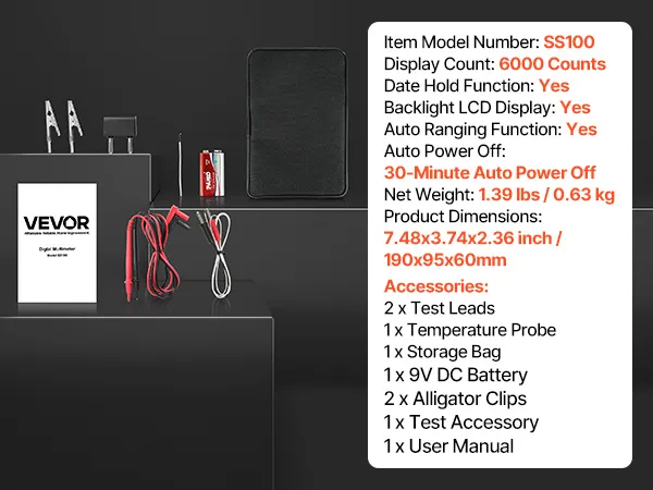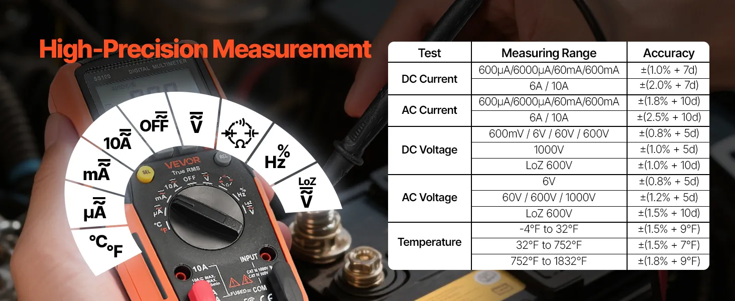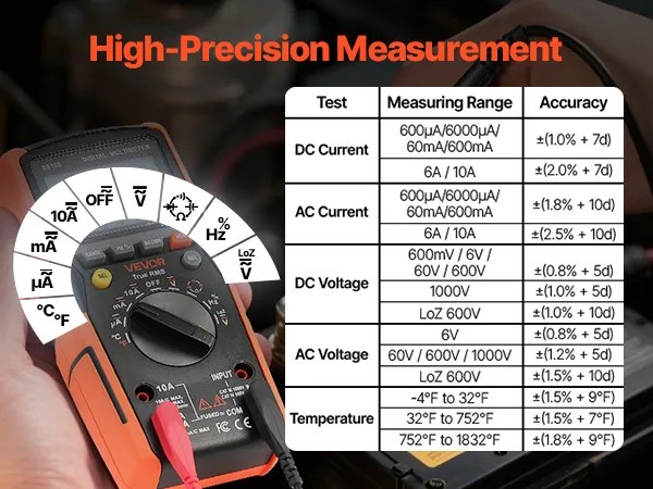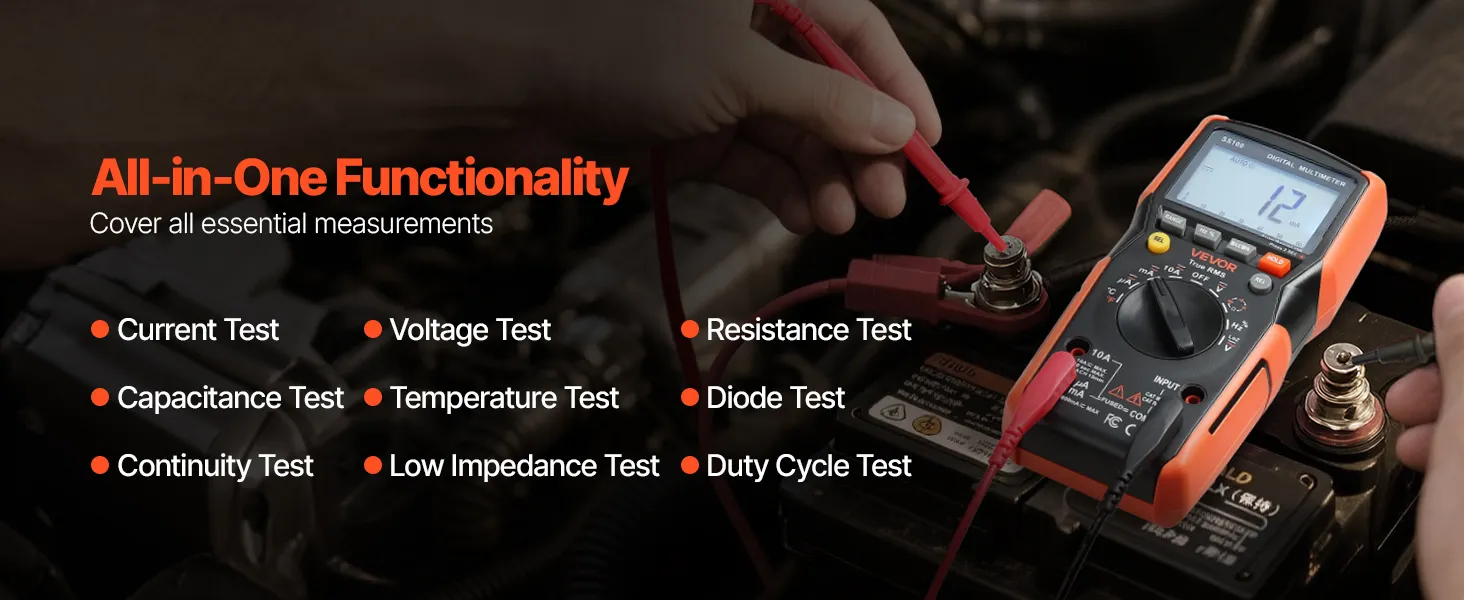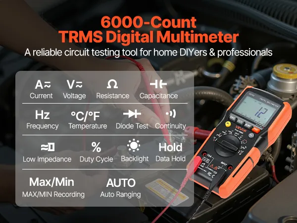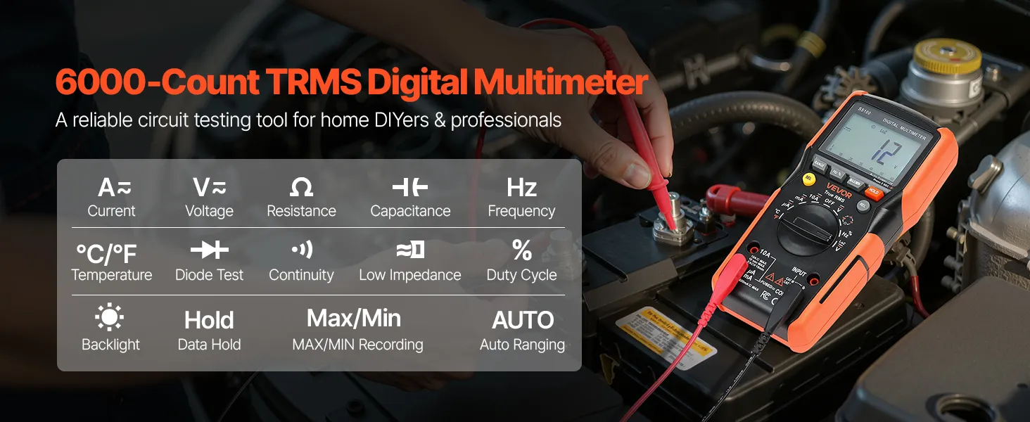 Il multimetro digitale TRMS VEVOR a 6000 punti supporta test di corrente, tensione, resistenza, capacità, frequenza, diodi, continuità, bassa impedenza e duty cycle. Grazie alla tecnologia Auto Ranging e True RMS, è in grado di misurare il vero valore di forme d'onda non sinusoidali.