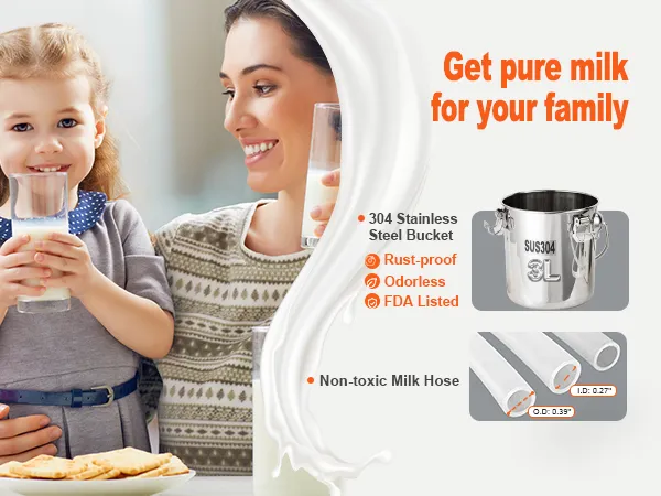 Sano e sicuro: il nostro secchio da 0,8 galloni/3 litri è realizzato in acciaio inossidabile 304 per uso alimentare e viene fornito con un tubo in silicone alimentare lungo 4,1 piedi, atossico e inodore. Ciò garantisce che il gusto originale del latte venga preservato, offrendoti un latte puro e pulito da gustare.