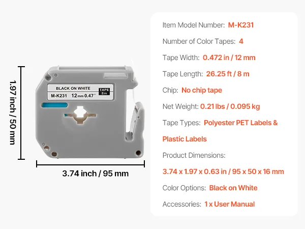 VEVOR Nastro per Etichette, 4 Pezzi, Ricariche per Etichettatrice Nero su Bianco 12 mm, per Vari Tipi di Etichettatrici Brother, Resistente e di Lunga Durata, Sostituzione per Letra Tag M-K231