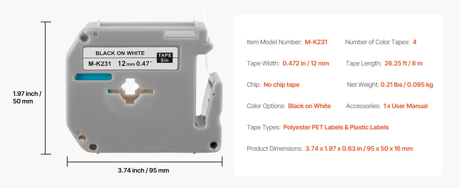 Ampia compatibilità: questo nastro per etichette nero su bianco è compatibile con il nastro Brother M-K231. Ogni rotolo è largo 12 mm e lungo 8 m, ed è compatibile con le stampanti Brother PT-M95, PT-90, PT-70BM, PT-85, PT-80 e altre ancora