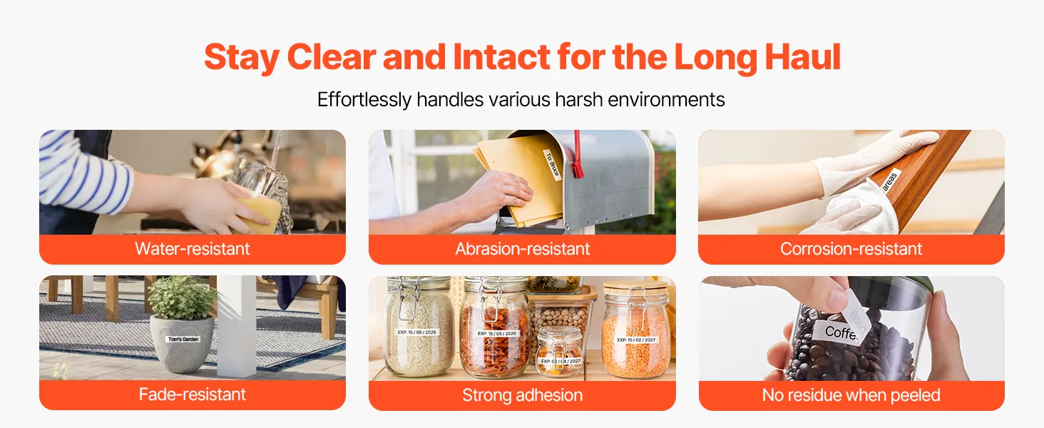 Durevole e duraturo: costruito per durare. Realizzato in PET di alta qualità, questo nastro per etichette è impermeabile, resistente ai graffi e allo sbiadimento