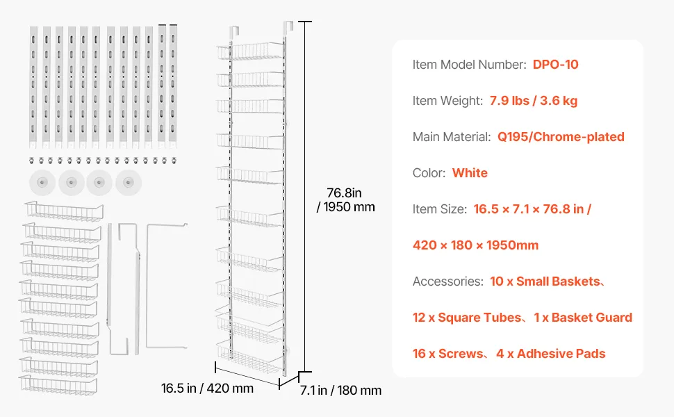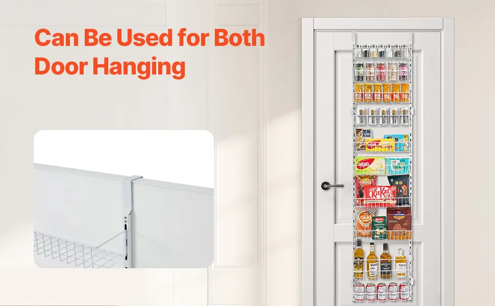 Questo organizzatore da dispensa sopra la porta è dotato di 10 grandi cestini, massimizzando la capacità di stoccaggio. Puoi usarlo come organizzatore per la porta della dispensa, porta spezie o organizzatore per l'armadio, perfetto per piccoli spazi.