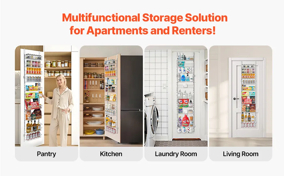 Questo organizzatore per spezie sospeso è versatile. Puoi usarlo come organizzatore per spezie sulla porta della cucina, come organizzatore per armadio in lavanderia o come organizzatore per dispensa sulla porta. Aggiunge spazio di archiviazione extra.